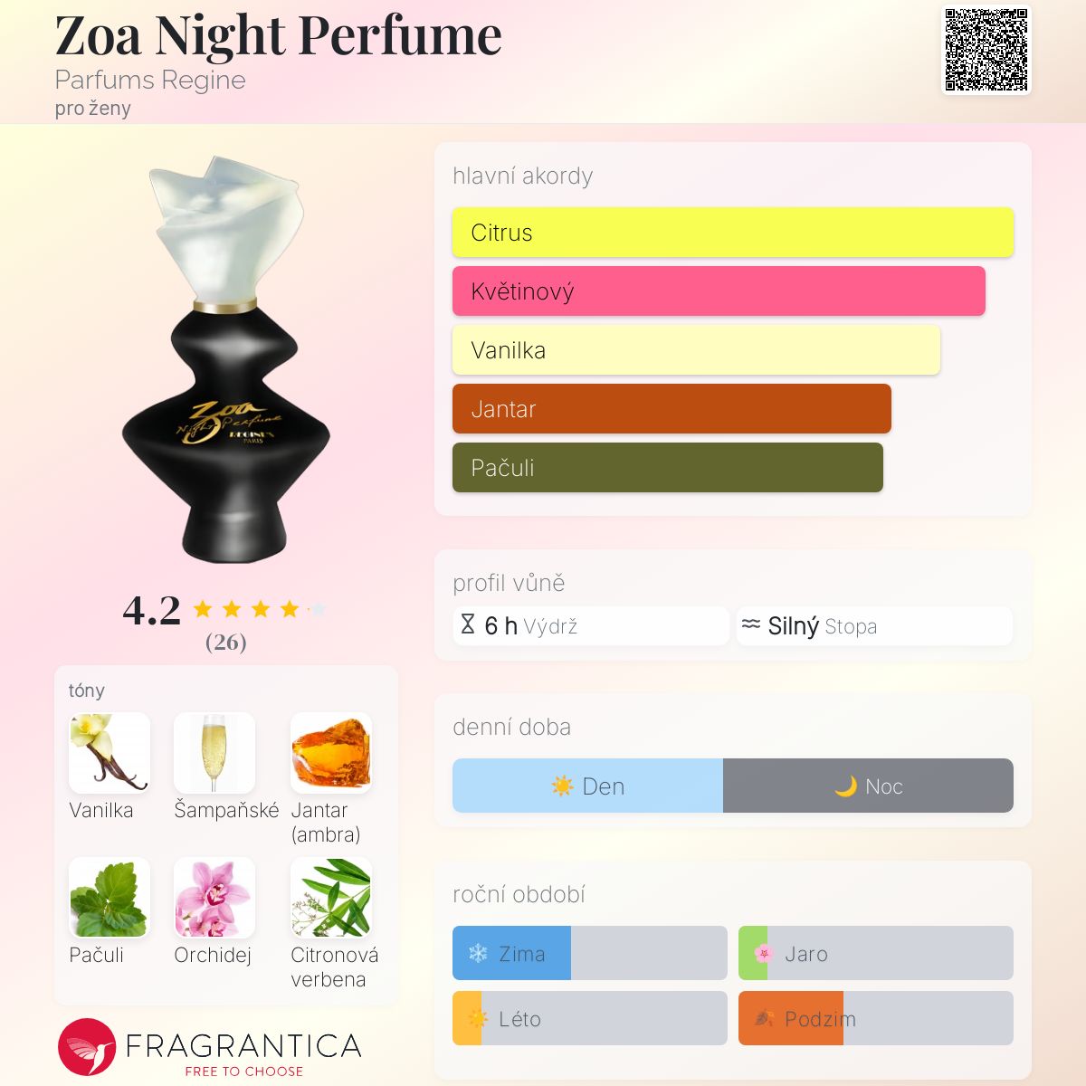 Zoa Night Perfume podle Parfums Regine je Orientální Floral vůně pro ženy. Zoa Night Perfume byl/a uveden/a v roce 2009. "Nosem" za touto vůní je Emilie Coppermann. Vrchní tóny jsou Šampaňské, Citronová verbena a Yuzu; střední tóny jsouOrchidej, Pivoňka a Růže ; základní tóny jsou Vanilka, Jantar (ambra) a Pačuli.