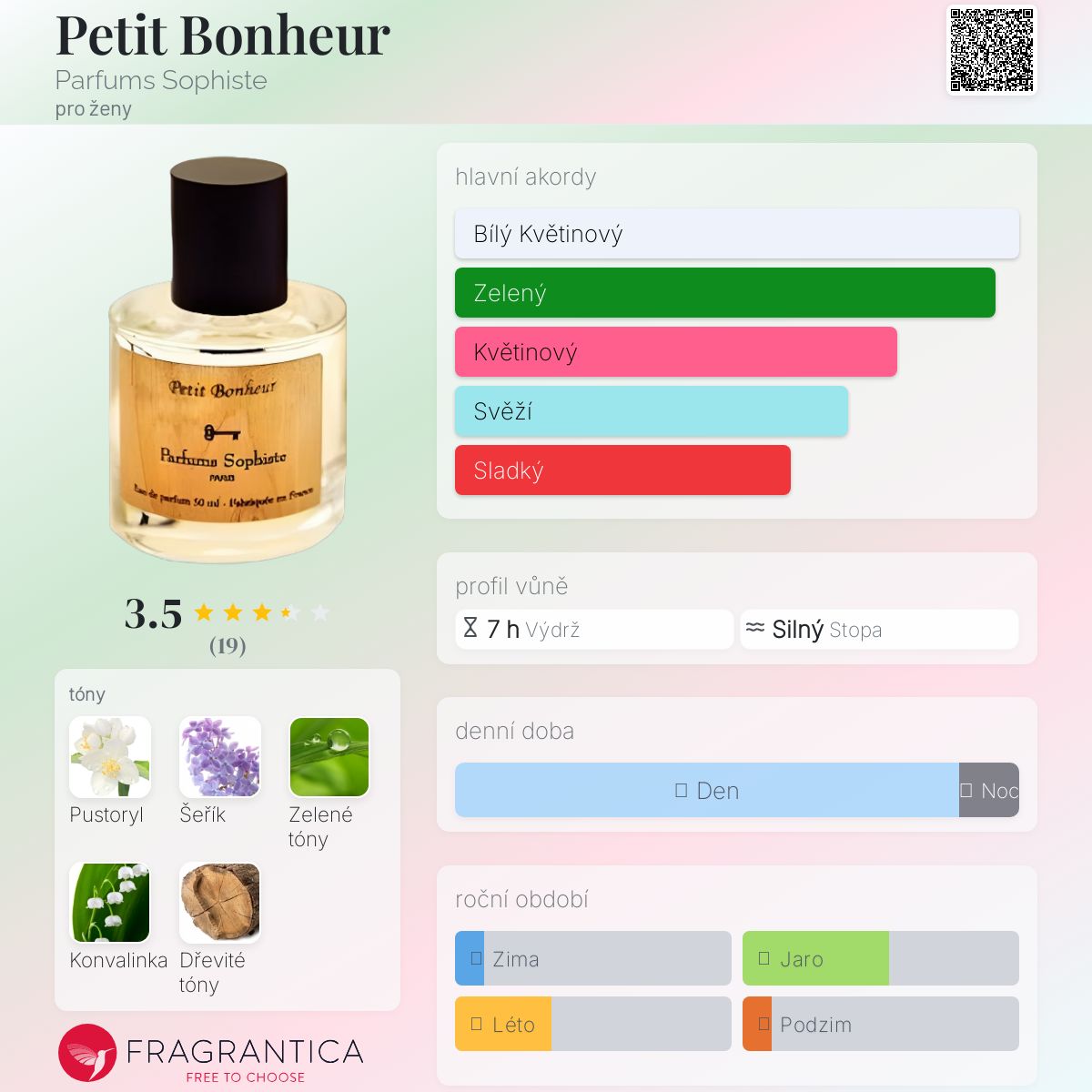 Petit Bonheur podle Parfums Sophiste je Floral Green vůně pro ženy. Petit Bonheur byl/a uveden/a v roce 2012. Vrchní tóny jsou Zelené tóny a Konvalinka; střední tóny jsouPustoryl a Šeřík ; základní tón je Bílé dřevo.
