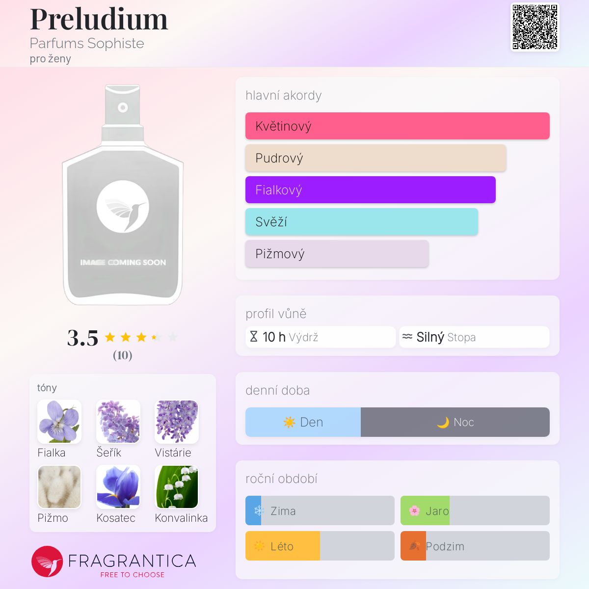 Preludium podle Parfums Sophiste je Floral Woody Musk vůně pro ženy. Preludium byl/a uveden/a v roce 2013. Vrchní tóny jsou Fialka, Vistárie a Jasmín; střední tóny jsouŠeřík, Kosatec a Konvalinka ; základní tóny jsou Pižmo a Cedr.