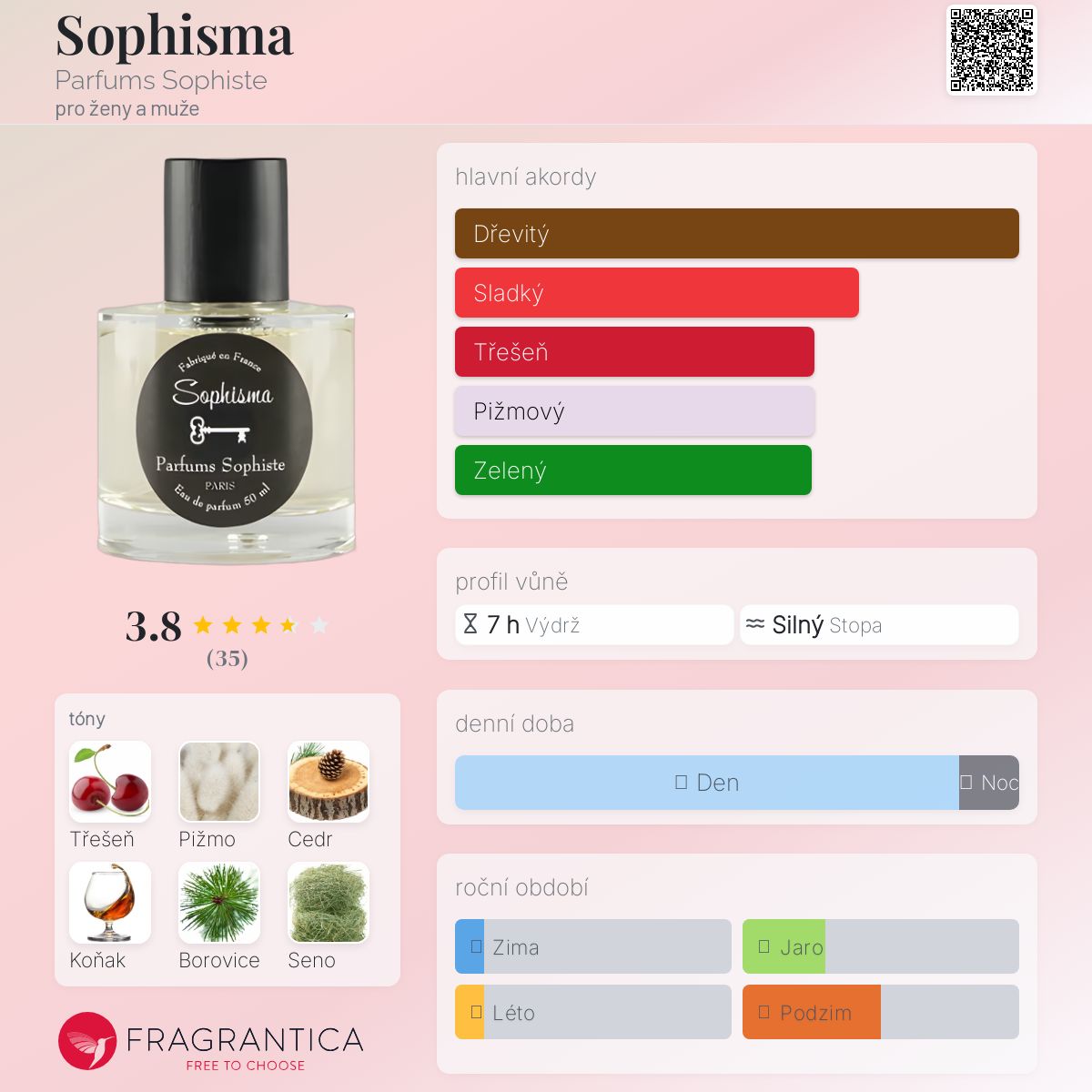 Sophisma podle Parfums Sophiste je Woody Aromatic vůně pro ženy a muže. Sophisma byl/a uveden/a v roce 2012. Vrchní tóny jsou Koňak a Zelený čaj; střední tóny jsouTřešeň, Borovice, Tabák a Pačuli ; základní tóny jsou Pižmo, Cedr, Seno a Fazole tonka.