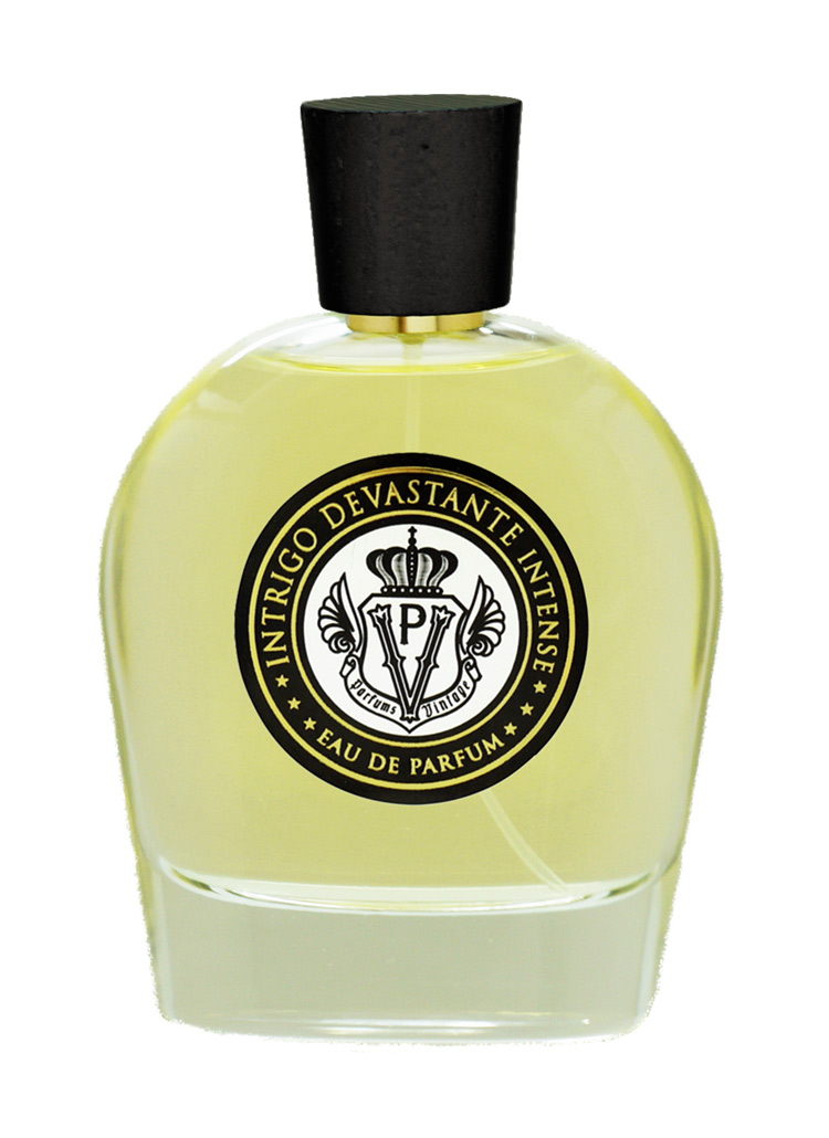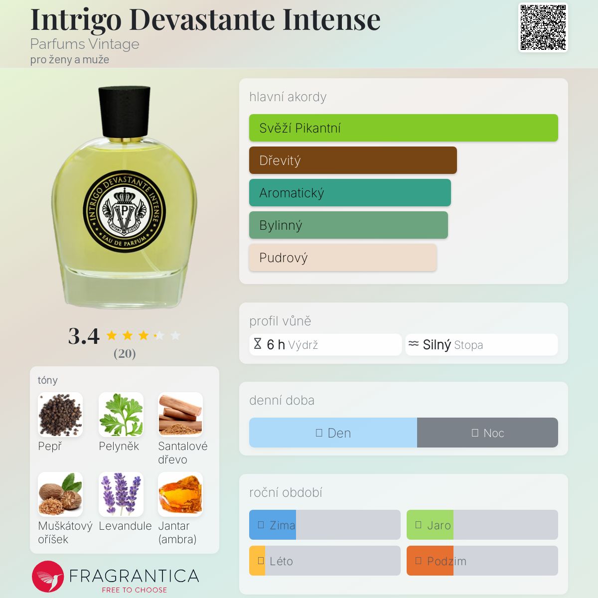 Intrigo Devastante Intense podle Parfums Vintage je Woody Spicy vůně pro ženy a muže. Intrigo Devastante Intense byl/a uveden/a v roce 2018. "Nosem" za touto vůní je Damien Stammers. Vrchní tóny jsou Pepř, Muškátový oříšek a Citronová verbena; střední tóny jsouPelyněk, Levandule, Kosatec a Bergamot ; základní tóny jsou Santalové dřevo, Jantar (ambra), Kůže a Guajakové dřevo.
