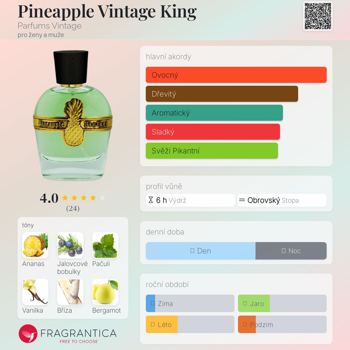 Pineapple Vintage King podle Parfums Vintage je Woody Aromatic vůně pro ženy a muže. Pineapple Vintage King byl/a uveden/a v roce 2018. "Nosem" za touto vůní je Damien Stammers. Vrchní tóny jsou Ananas, Jalovcové bobulky a Jablko; střední tóny jsouBergamot, Černý rybíz, Růže a Jasmín ; základní tóny jsou Pačuli, Vanilka, Bříza, Ambra a Pižmo.