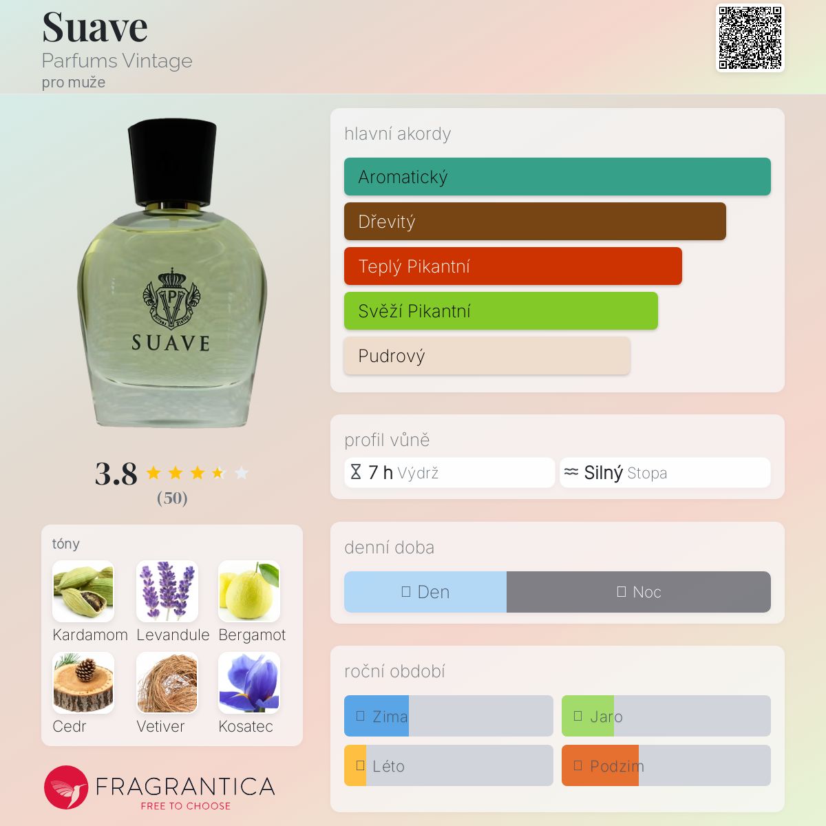 Suave podle Parfums Vintage je Woody Aromatic vůně pro muže. Suave byl/a uveden/a v roce 2017. "Nosem" za touto vůní je Damien Stammers. Vrchní tóny jsou Kardamom, Levandule a Bergamot; střední tóny jsouCedr, Kosatec, Kmín a Pačuli ; základní tóny jsou Vetiver, Ambra a Pižmo.