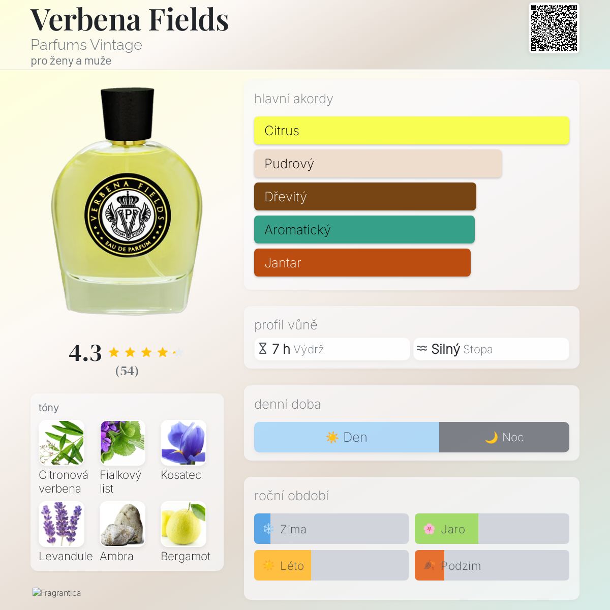 Verbena Fields podle Parfums Vintage je Aromatic Fougere vůně pro ženy a muže. Verbena Fields byl/a uveden/a v roce 2018. "Nosem" za touto vůní je Damien Stammers. Vrchní tón je Citronová verbena ; střední tóny jsouFialkový list, Kosatec, Levandule a Bergamot ; základní tóny jsou Ambra, Santalové dřevo a Bílé pižmo.