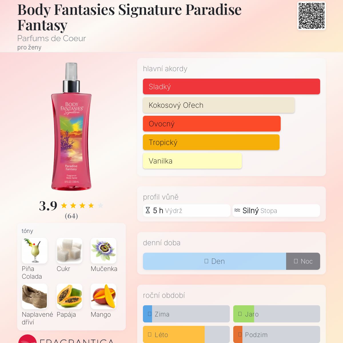 Body Fantasies Signature Paradise Fantasy podle Parfums de Coeur je Floral Fruity Gourmand vůně pro ženy. Vrchní tóny jsou Piña Colada, Mango a Mandarinka; střední tóny jsouMučenka, Papája a Kokosový květ ; základní tóny jsou Cukrová třtina, Naplavené dříví a Pižmo.