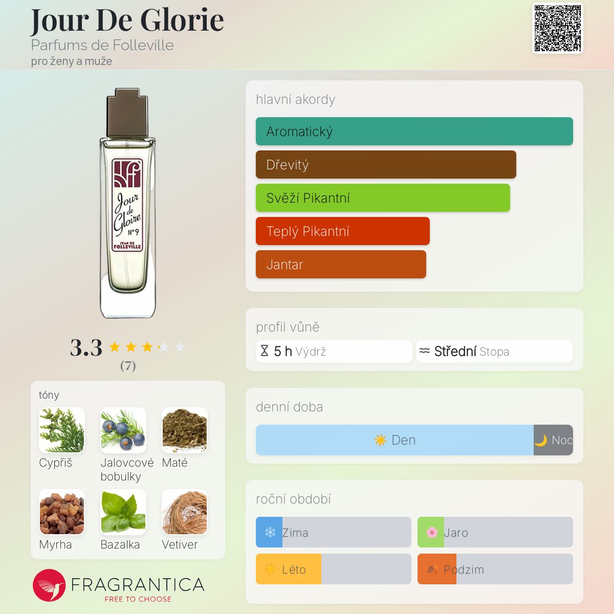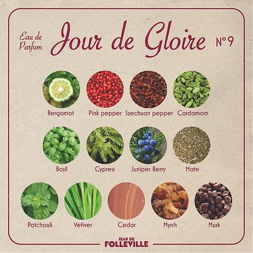 Jour De Glorie podle Parfums de Folleville je Aromatic Fougere vůně pro ženy a muže. Jour De Glorie byl/a uveden/a v roce 2021. "Nosem" za touto vůní je Bertrand Duchaufour. Vrchní tóny jsou Bazalka, Kalábrijský bergamot, Kardamom, Růžový pepř a Sečuánský pepř; střední tóny jsouCypřiš, Jalovcové bobulky a Maté ; základní tóny jsou Myrha, Vetiver, Pačuli, Cedr a Pižmo.
