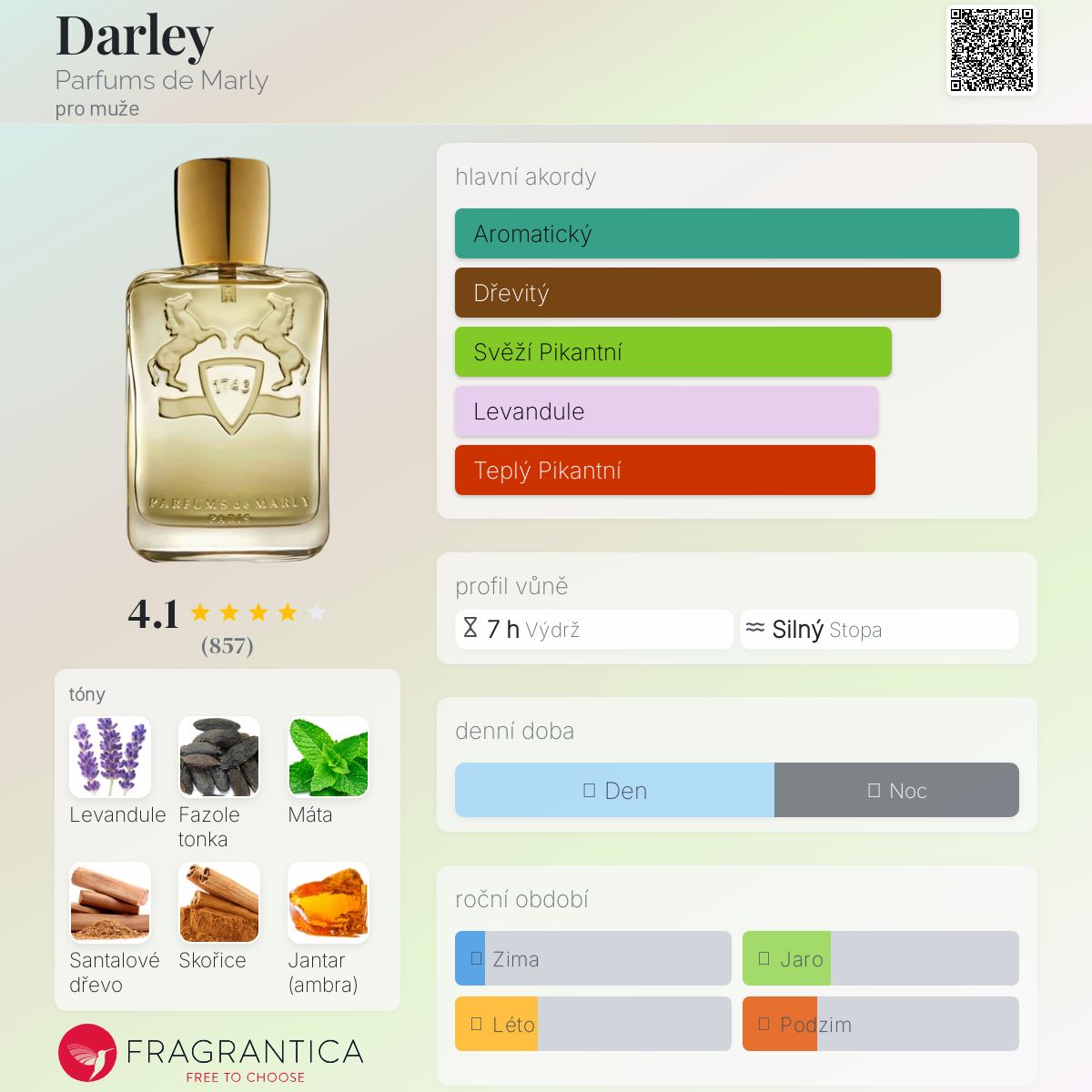 Darley podle Parfums de Marly je Orientální Fougere vůně pro muže. Darley byl/a uveden/a v roce 2009. "Nosem" za touto vůní je Francis Deleamont. Vrchní tóny jsou Máta, Bergamot a Citron amalfi; střední tóny jsouLevandule, Skořice, Květ afrického pomeranče, Růže a Rozmarýn ; základní tóny jsou Fazole tonka, Santalové dřevo, Jantar (ambra), Guajakové dřevo a Pačuli.