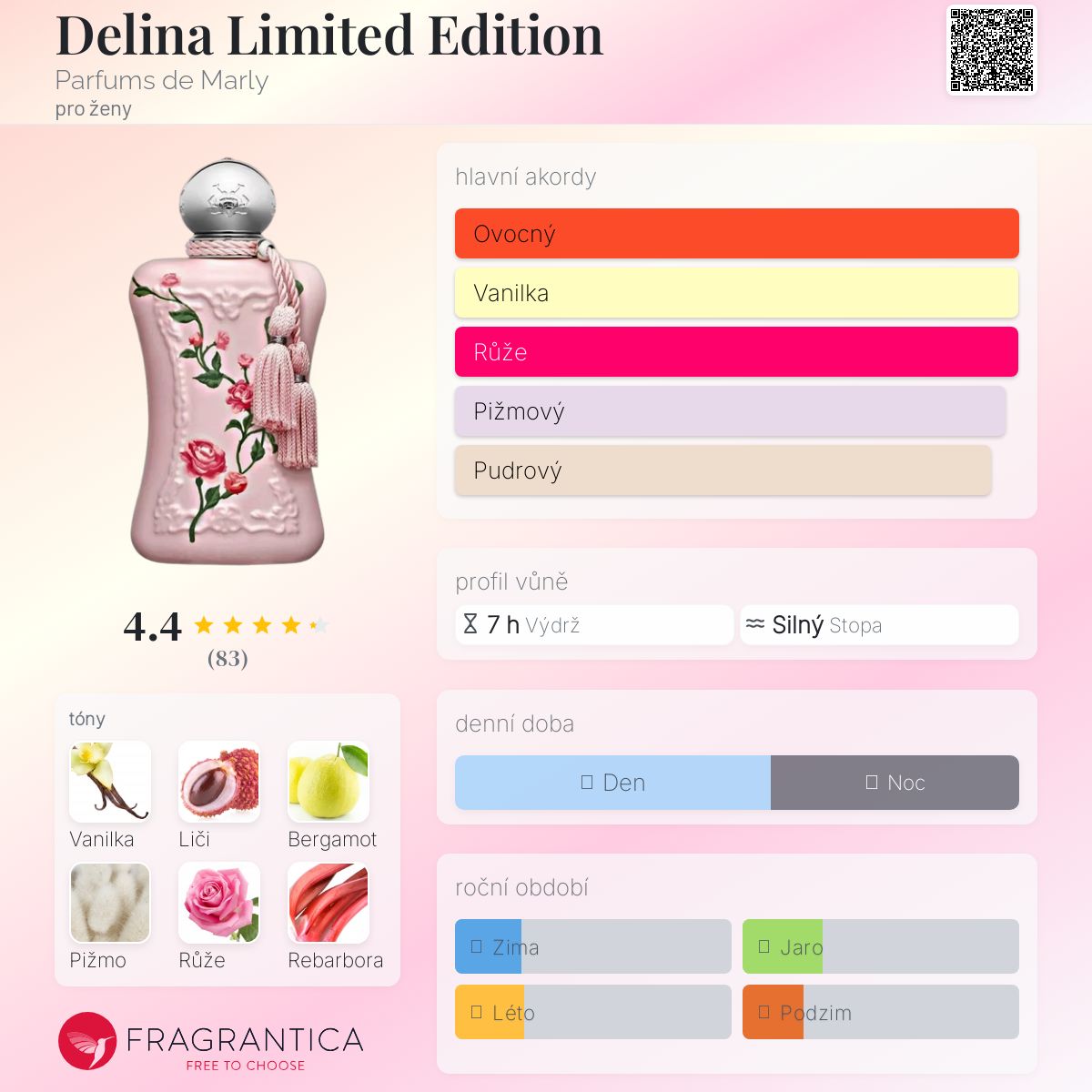 Delina Limited Edition podle Parfums de Marly je Floral vůně pro ženy. Toto je nová vůně. Delina Limited Edition byl/a uveden/a v roce 2024. "Nosem" za touto vůní je Quentin Bisch. Vrchní tóny jsou Liči, Bergamot a Rebarbora; střední tóny jsouVanilka, Květná růže a Pivoňka ; základní tóny jsou Pižmo, Kašmír a Vetiver.