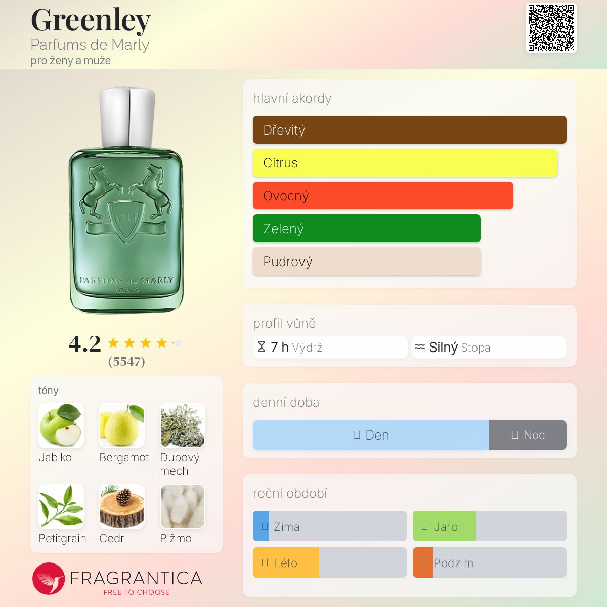 Greenley podle Parfums de Marly je Citrus Aromatic vůně pro ženy a muže. Greenley byl/a uveden/a v roce 2020. "Nosem" za touto vůní je Nathalie Templer. Vrchní tóny jsou Zelené jablko, Kalábrijský bergamot a Mandarinka; střední tóny jsouPetitgrain, Cedr, Kašmír, Pomarose a Fialka ; základní tóny jsou Dubový mech, Pižmo a Jantarové dřevo.