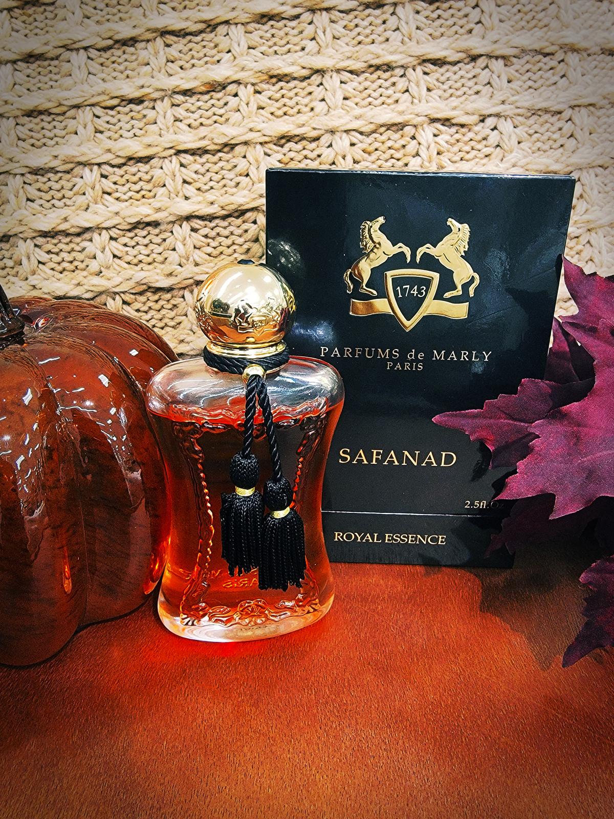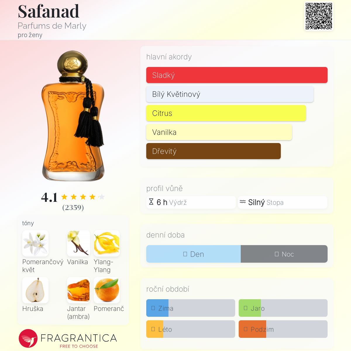 Safanad podle Parfums de Marly je Floral vůně pro ženy. Safanad byl/a uveden/a v roce 2013. "Nosem" za touto vůní je Fabrice Pellegrin. Vrchní tóny jsou Hruška a Pomeranč; střední tóny jsouPomerančový květ, Ylang-Ylang a Kosatec ; základní tóny jsou Vanilka, Jantar (ambra) a Santalové dřevo.