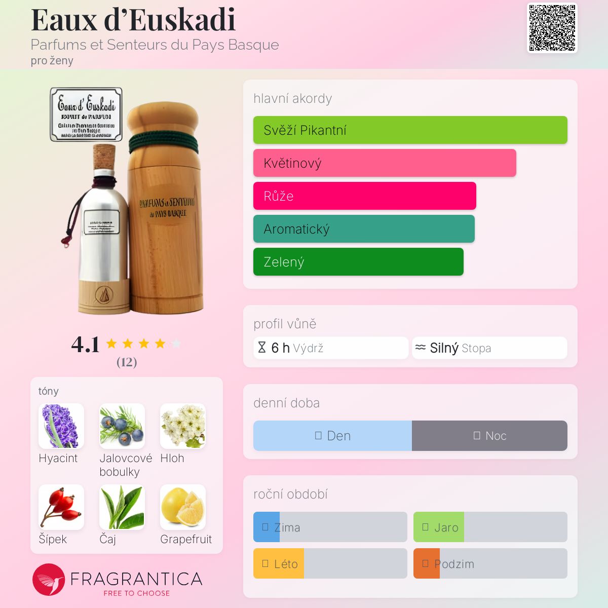 Eaux d’Euskadi podle Parfums et Senteurs du Pays Basque je Floral Green vůně pro ženy. Eaux d’Euskadi byl/a uveden/a v roce 2006. Vrchní tóny jsou Hyacint, Jalovcové bobulky, Hloh a Šípek; střední tóny jsouČaj, Grapefruit a Citrón ; základní tóny jsou Růžový pepř a Pepř.