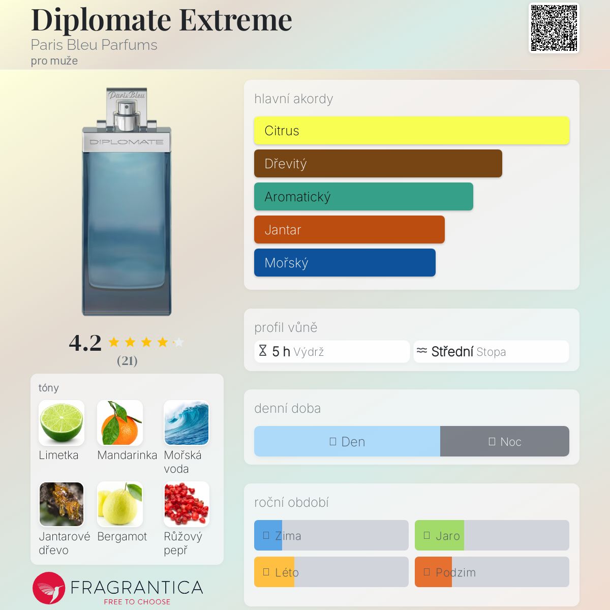 Diplomate Extreme podle Paris Bleu Parfums je Citrus Aromatic vůně pro muže. Vrchní tóny jsou Limetka, Mandarinka, Bergamot a Růžový pepř; střední tóny jsouMandarinka, Mořské tóny, Levandule, Šalvěj a Petitgrain ; základní tóny jsou Jantarové dřevo, Santalové dřevo, Vanilka, Kašmírové dřevo, Pačuli a Mech.