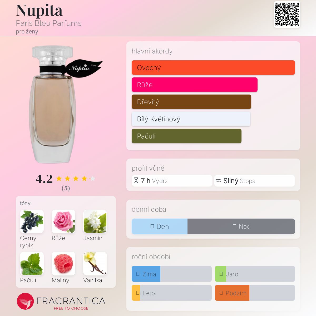 Nupita podle Paris Bleu Parfums je Floral Fruity vůně pro ženy. Vrchní tóny jsou Černý rybíz, Maliny, Liči a Jablko; střední tóny jsouRůže, Jasmín, Pačuli a Frézie ; základní tóny jsou Vanilka, Ambra, Bílé dřevo, Pižmo a Sladké tóny.