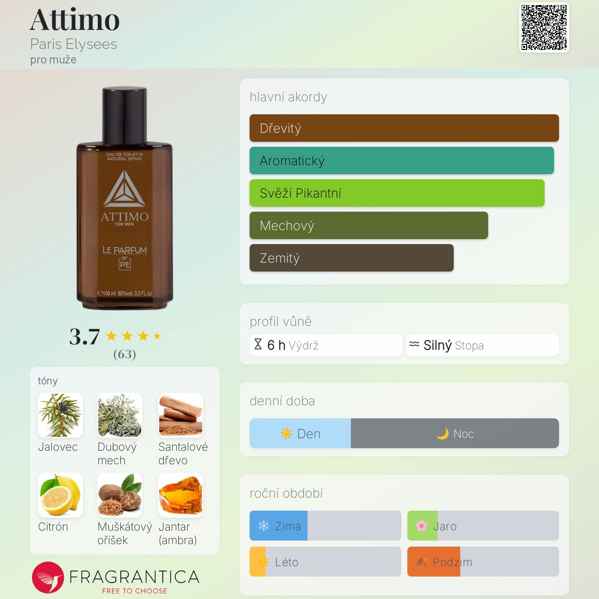 Attimo podle Paris Elysees je Aromatic Spicy vůně pro muže. Attimo byl/a uveden/a v roce 2017. Vrchní tóny jsou Citrón a Tymián; střední tóny jsouJalovec, Muškátový oříšek a Jasmín ; základní tóny jsou Mech, Santalové dřevo a Jantar (ambra).