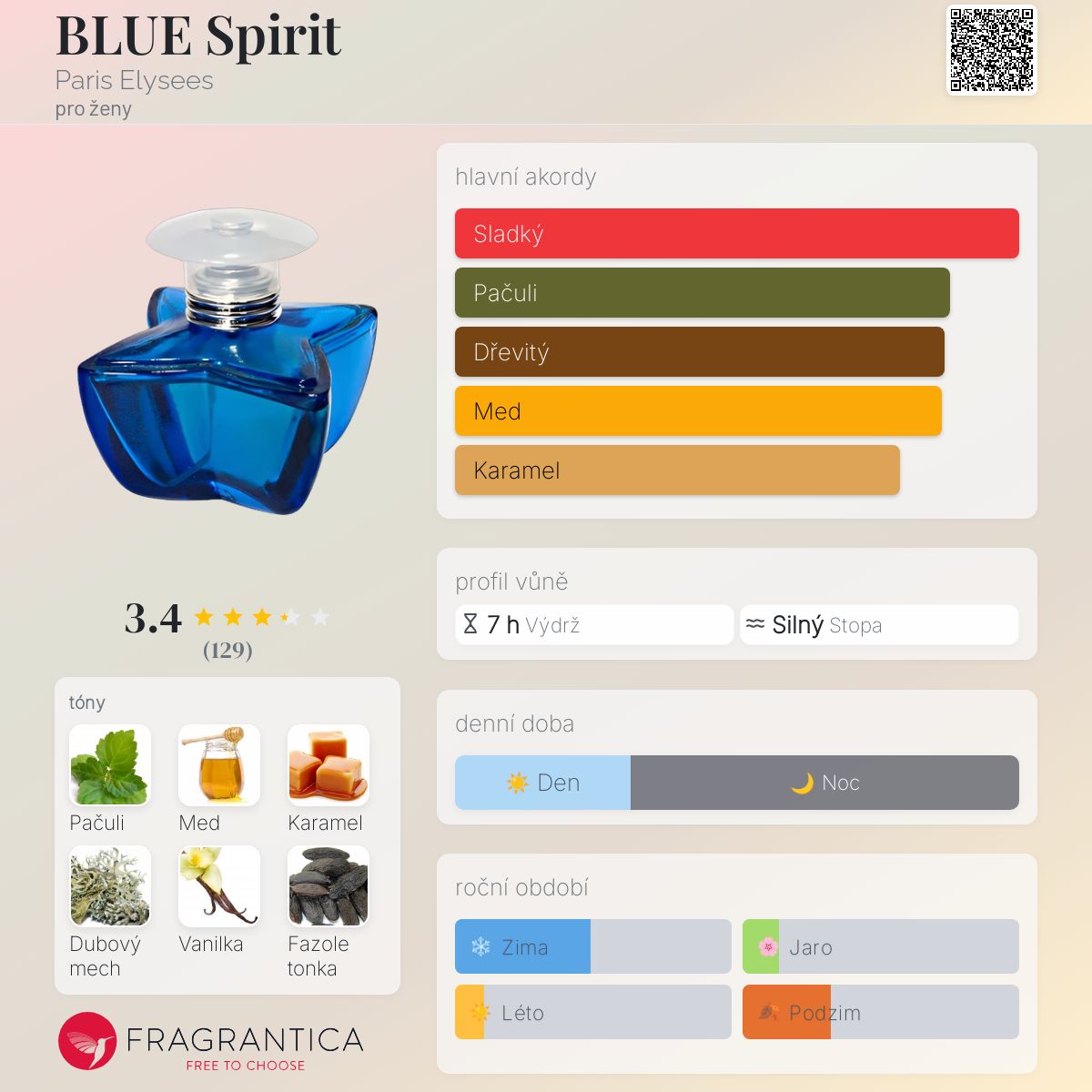 BLUE Spirit podle Paris Elysees je Orientální Floral vůně pro ženy. BLUE Spirit byl/a uveden/a v roce 2012. Vrchní tóny jsou Kokos, Sirup z černého rybízu, Zelené tóny, Ostružina, Jahoda a Bergamot; střední tóny jsouMed, Jasmín, Orchidej, Růže a Konvalinka ; základní tóny jsou Pačuli, Karamel, Mech, Vanilka, Fazole tonka, Jantar (ambra) a Santalové dřevo.