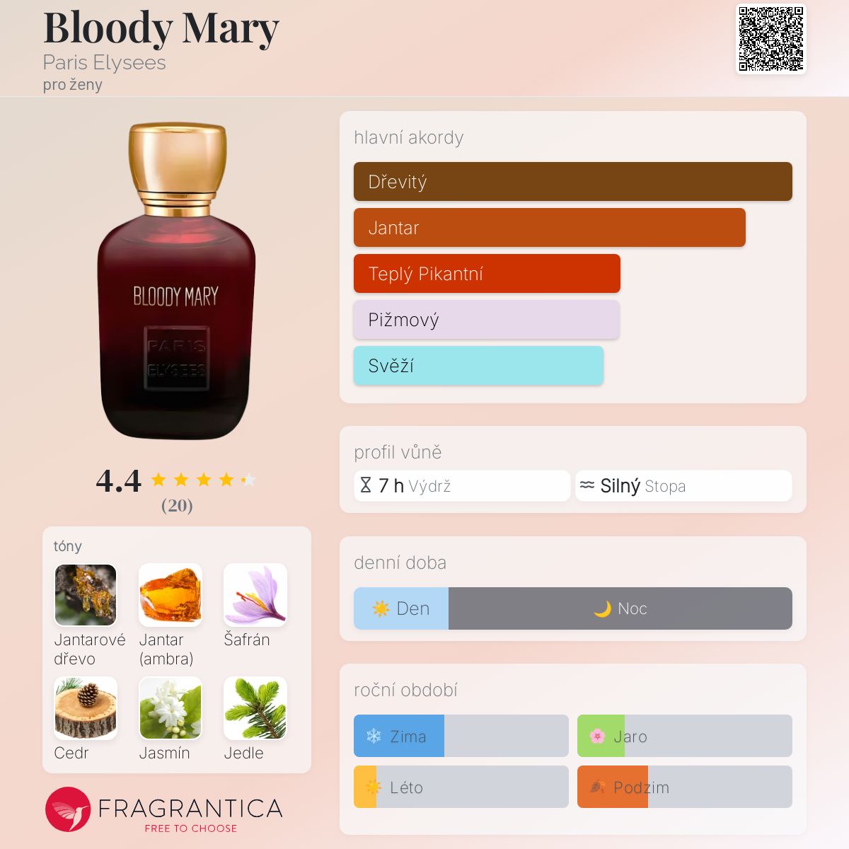 Bloody Mary podle Paris Elysees je Orientální Floral vůně pro ženy. Toto je nová vůně. Bloody Mary byl/a uveden/a v roce 2025. Vrchní tóny jsou Šafrán a Jasmín; střední tóny jsouJantarové dřevo, Jantar (ambra) a Hedione ; základní tóny jsou Cedr, Jedlová pryskyřice, Pižmo, Dub a Ambroxan.