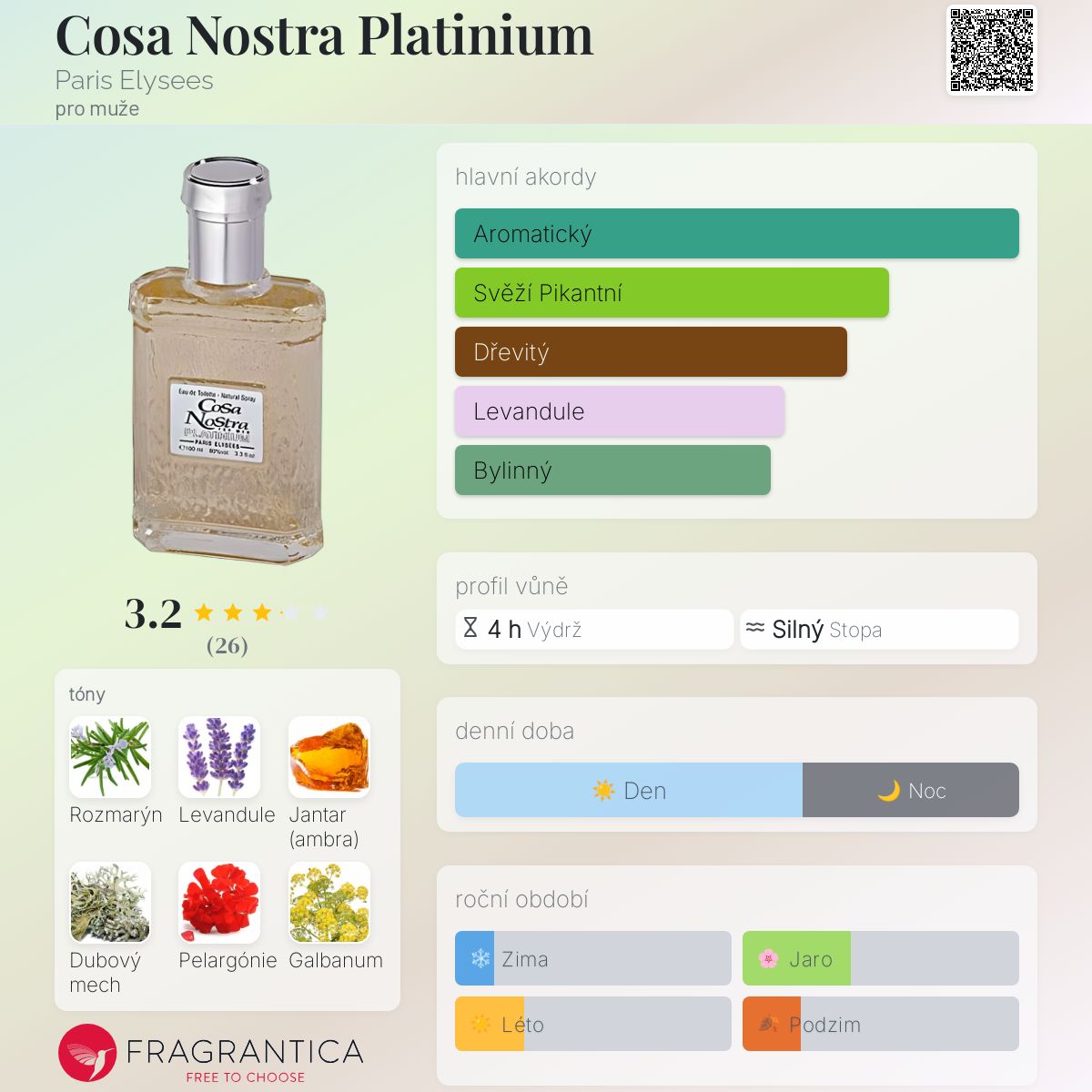 Cosa Nostra Platinium podle Paris Elysees je Woody Floral Musk vůně pro muže. Cosa Nostra Platinium byl/a uveden/a v roce 1994. Vrchní tóny jsou Rozmarýn, Levandule, Petitgrain a Neroli; střední tóny jsouPelargónie, Galbanum, Šalvěj a Jasmín ; základní tóny jsou Jantar (ambra), Dubový mech, Vetiver, Santalové dřevo a Cedr.