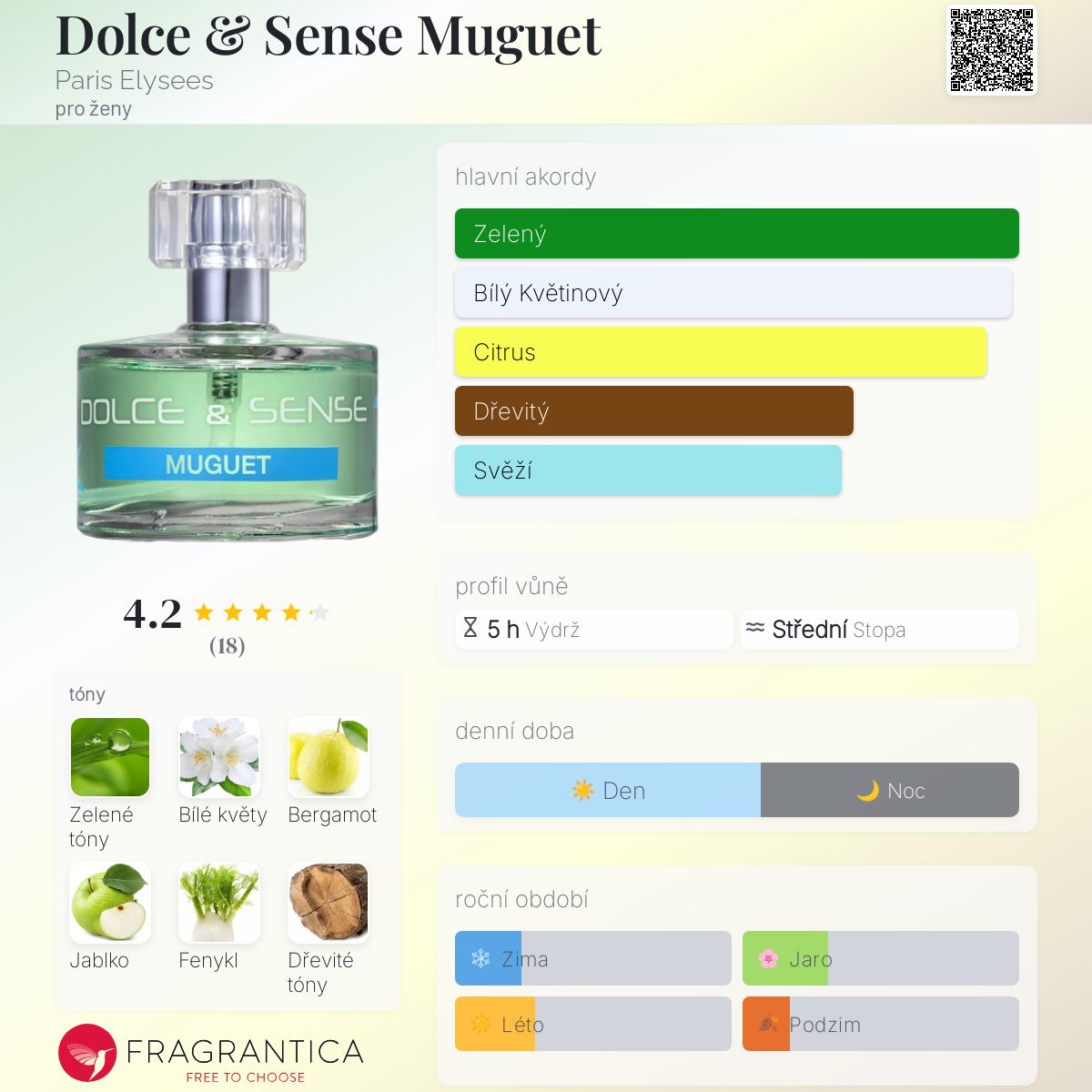 Dolce & Sense Muguet podle Paris Elysees je Floral vůně pro ženy. Dolce & Sense Muguet byl/a uveden/a v roce 2019. Vrchní tóny jsou Zelené tóny, Bergamot, Jablko, Fenykl, Citrón a Pomeranč; střední tóny jsouBílé květy, Bílé dřevo, Jasmín Sambac a Růže ; základní tóny jsou Mech a Vanilka.