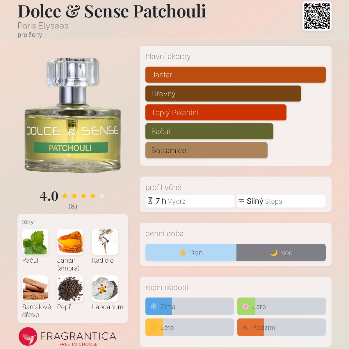 Dolce & Sense Patchouli podle Paris Elysees je Aromatic Fruity vůně pro ženy. Dolce & Sense Patchouli byl/a uveden/a v roce 2019. Vrchní tóny jsou Černý pepř, Hořký pomeranč, Rozmarýn, Fenykl a Maliny; střední tóny jsouPačuli, Kadidlo, Santalové dřevo a Labdanum ; základní tóny jsou Jantar (ambra) a Vanilka.