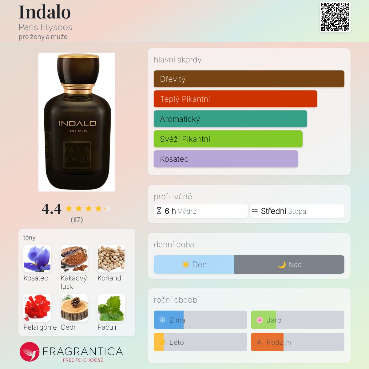 Indalo podle Paris Elysees je Woody Spicy vůně pro ženy a muže. Toto je nová vůně. Indalo byl/a uveden/a v roce 2025. Vrchní tóny jsou Koriandr, Pelargónie a Černý pepř; střední tóny jsouKosatec, Kakaový lusk a Cedr ; základní tóny jsou Pačuli a Santalové dřevo.