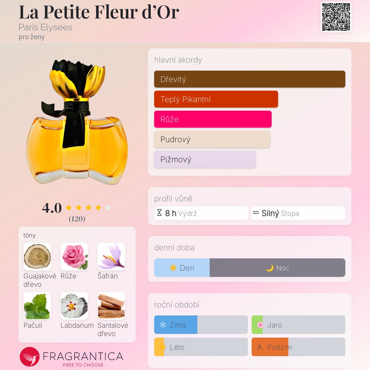 La Petite Fleur d’Or podle Paris Elysees je Orientální Woody vůně pro ženy. La Petite Fleur d’Or byl/a uveden/a v roce 2015. Vrchní tóny jsou Šafrán a Bergamot; střední tóny jsouGuajakové dřevo, Růže, Cedr a Fialka ; základní tóny jsou Pačuli, Labdanum, Santalové dřevo a Bílé pižmo.