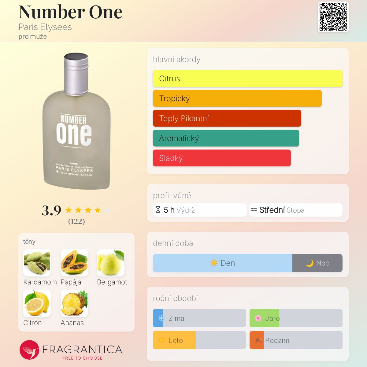 Number One podle Paris Elysees je Aromatic vůně pro muže. Number One byl/a uveden/a v roce 1991. Vrchní tóny jsou Kardamom a Bergamot; střední tóny jsouCitrón a Ananas ; základní tón je Papája.