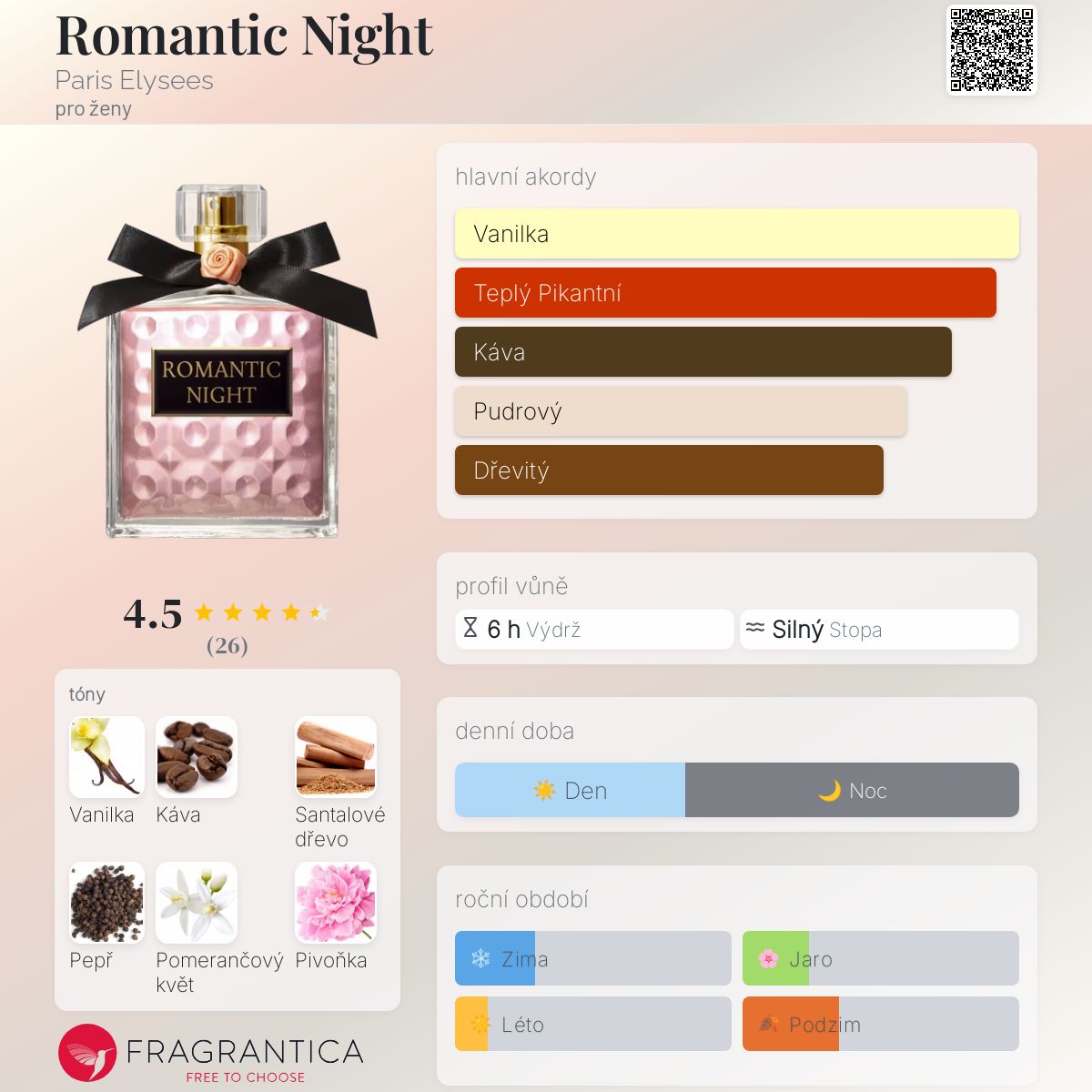 Romantic Night podle Paris Elysees je Orientální Floral vůně pro ženy. Romantic Night byl/a uveden/a v roce 2019. Vrchní tóny jsou Pepř a Anýz; střední tóny jsouKáva, Pomerančový květ, Pivoňka a Koriandr ; základní tóny jsou Vanilka, Santalové dřevo a Bílé pižmo.