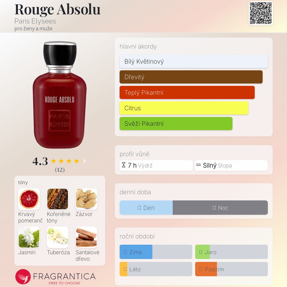 Rouge Absolu podle Paris Elysees je Floral vůně pro ženy a muže. Toto je nová vůně. Rouge Absolu byl/a uveden/a v roce 2025. Vrchní tóny jsou Krvavý pomeranč a Zázvor; střední tóny jsouKořeněné tóny, Jasmín a Tuberóza ; základní tóny jsou Santalové dřevo, Pačuli a Vetiver.