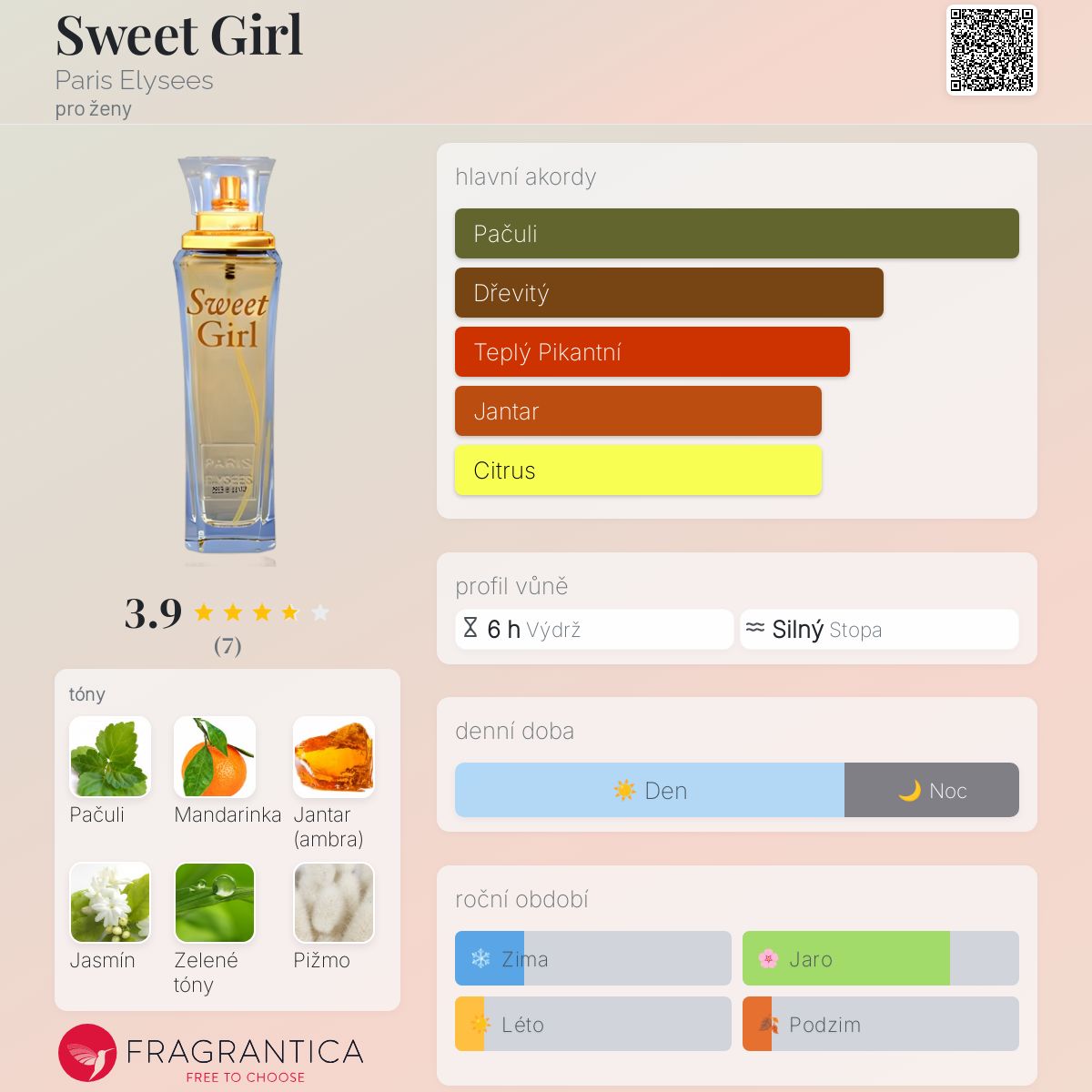 Sweet Girl podle Paris Elysees je Chypre vůně pro ženy. Sweet Girl byl/a uveden/a v roce 2012. Vrchní tóny jsou Mandarinka a Zelené tóny; střední tóny jsouJasmín a Růže ; základní tóny jsou Pačuli, Jantar (ambra) a Pižmo.