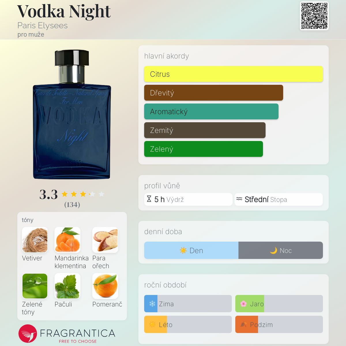Vodka Night podle Paris Elysees je Woody Spicy vůně pro muže. Vodka Night byl/a uveden/a v roce 2015. Vrchní tóny jsou Mandarinka klementina, Bylinné tóny, Pomeranč a Citrón; střední tóny jsouMuškátový oříšek, Kardamom a Květinové tóny ; základní tóny jsou Vetiver, Para ořech, Pačuli a Jantar (ambra).