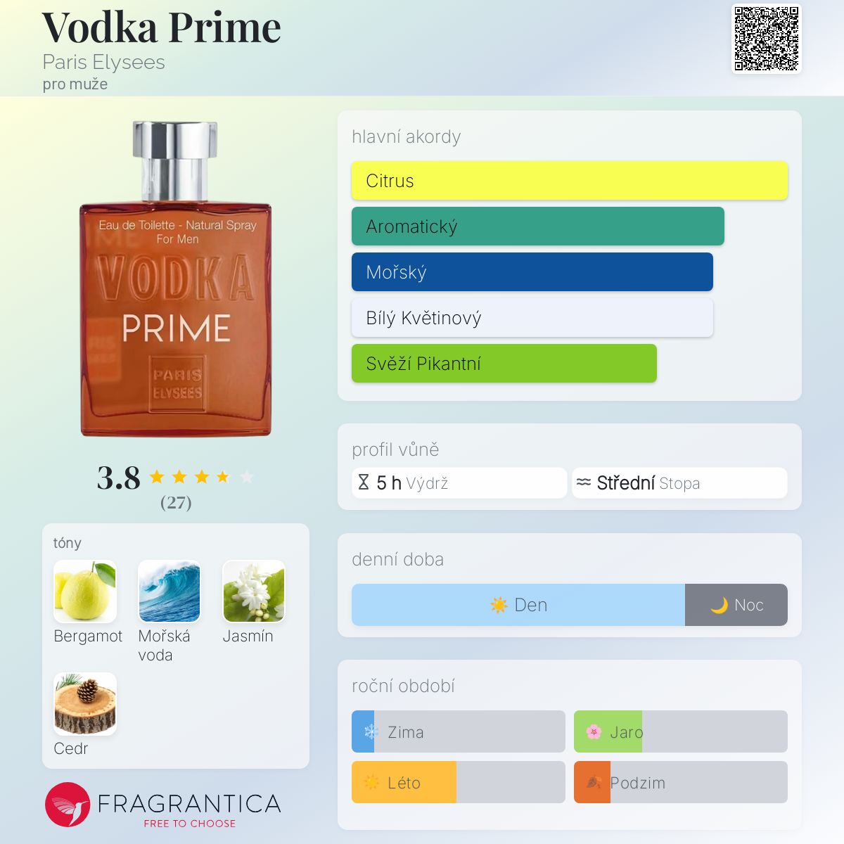 Vodka Prime podle Paris Elysees je Aromatic Aquatic vůně pro muže. Toto je nová vůně. Vodka Prime byl/a uveden/a v roce 2024. Vrchní tón je Bergamot ; střední tóny jsouVodní tóny a Jasmín ; základní tón je Cedr.