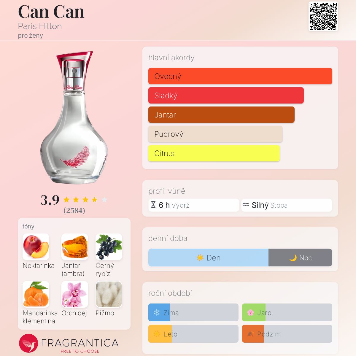 Can Can podle Paris Hilton je Floral Fruity vůně pro ženy. Can Can byl/a uveden/a v roce 2007. "Nosem" za touto vůní je Jean Claude Delville. Vrchní tóny jsou Nektarinka, Černý rybíz a Mandarinka klementina; střední tóny jsouDivoká orchidej a Pomerančový květ ; základní tóny jsou Jantar (ambra), Pižmo a Dřevité tóny.