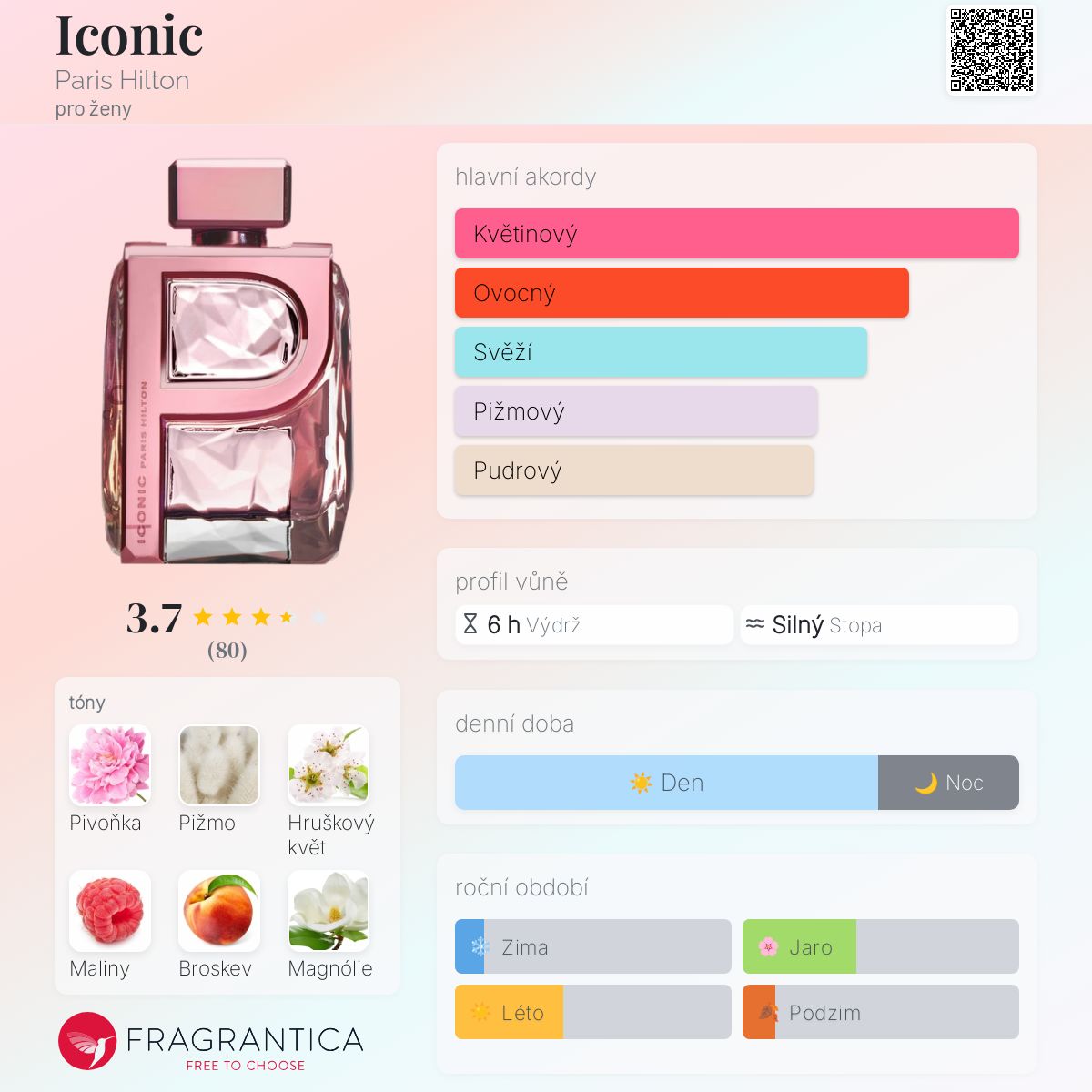 Iconic podle Paris Hilton je Floral Fruity vůně pro ženy. Toto je nová vůně. Iconic byl/a uveden/a v roce 2025. Vrchní tóny jsou Hruškový květ, Maliny a Broskev; střední tóny jsouPivoňka, Magnólie a Konvalinka ; základní tóny jsou Pižmo, Jantar (ambra) a Santalové dřevo.