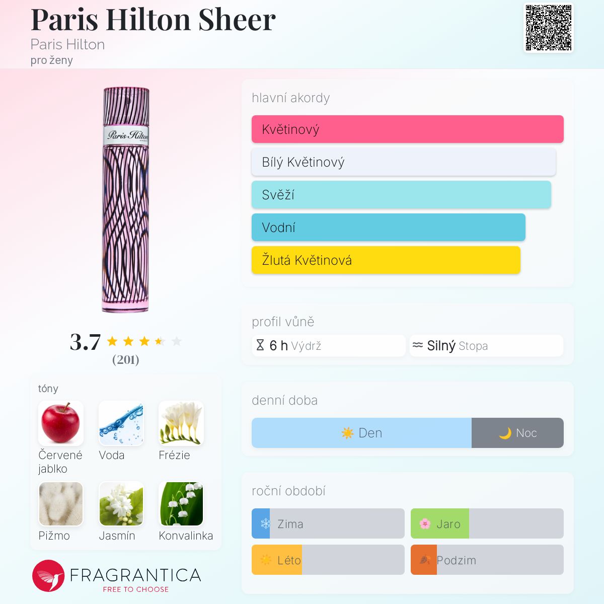 Paris Hilton Sheer podle Paris Hilton je Floral Fruity vůně pro ženy. Paris Hilton Sheer byl/a uveden/a v roce 2005. Vrchní tóny jsou Červené jablko a Vodní tóny; střední tóny jsouFrézie, Jasmín, Konvalinka a Mimóza ; základní tóny jsou Pižmo, Ylang-Ylang a Santalové dřevo.
