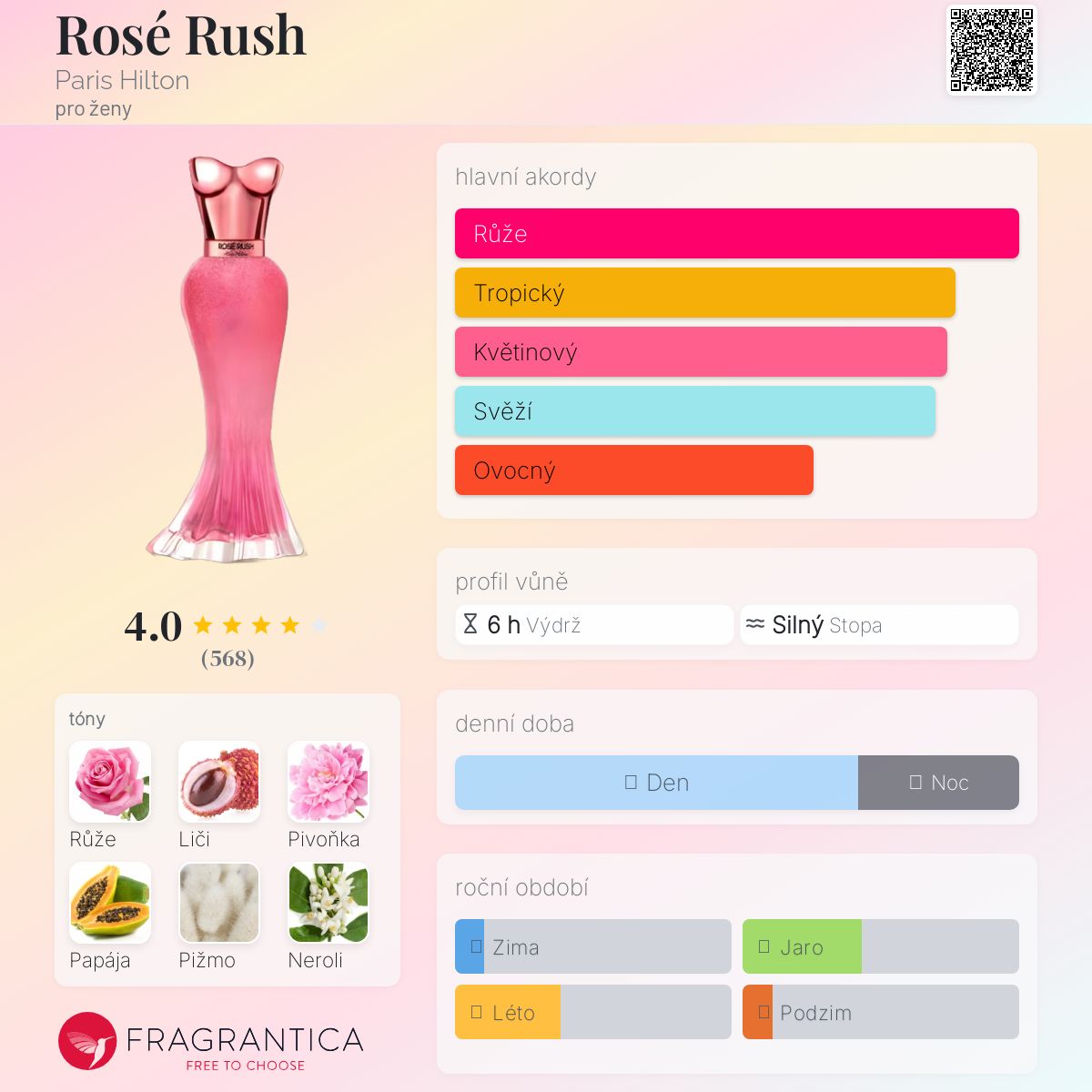 Rosé Rush podle Paris Hilton je Floral Fruity vůně pro ženy. Rosé Rush byl/a uveden/a v roce 2017. "Nosem" za touto vůní je Richard Herpin. Vrchní tóny jsou Okvětní lístky růží, Liči a Neroli; střední tóny jsouKvětná růže, Pivoňka a Papája ; základní tóny jsou Bílé pižmo, Jantar (ambra) a Cedr.