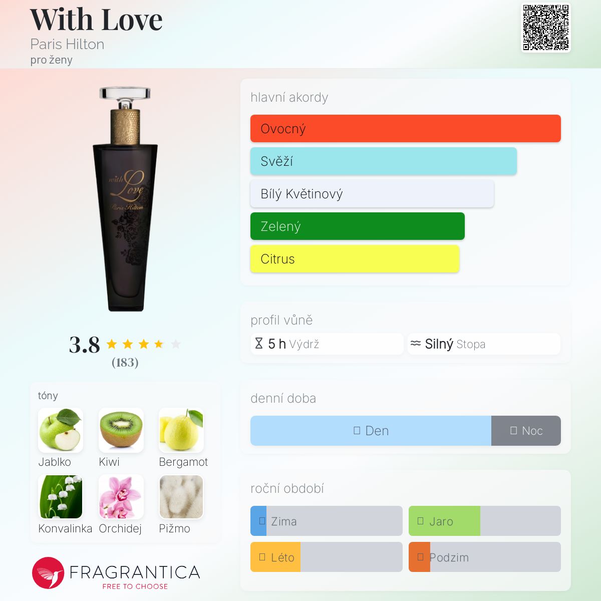 With Love podle Paris Hilton je Floral Fruity vůně pro ženy. With Love byl/a uveden/a v roce 2014. Vrchní tóny jsou Zelené jablko, Kiwi a Bergamot; střední tóny jsouKonvalinka, Orchidej a Divoký jasmín ; základní tóny jsou Pižmo a Dřevité tóny.
