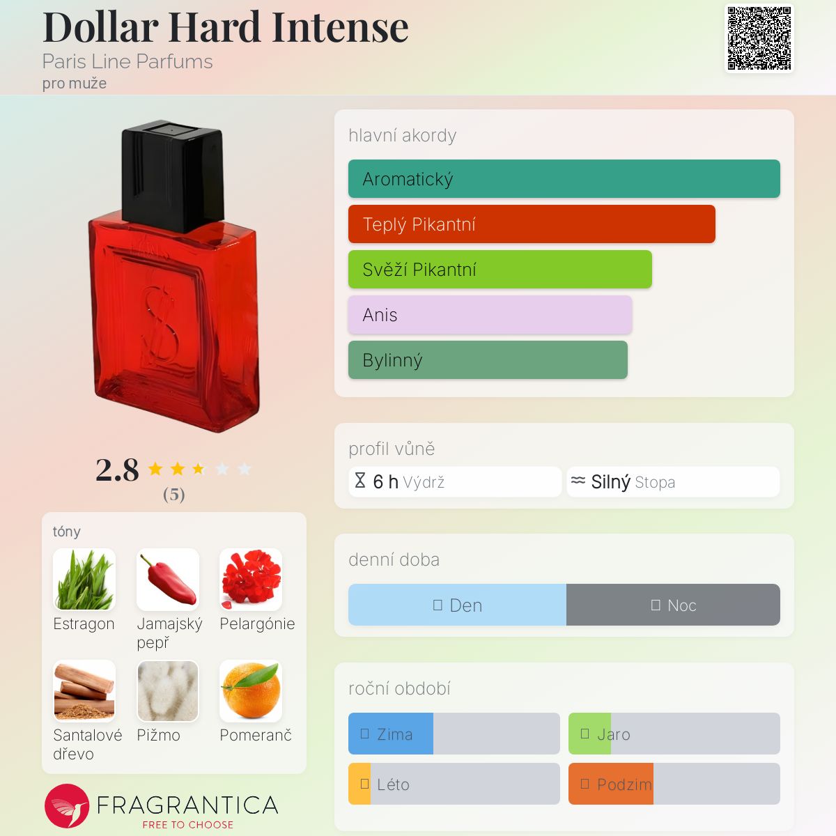 Dollar Hard Intense podle Paris Line Parfums je Orientální Fougere vůně pro muže. Toto je nová vůně. Dollar Hard Intense byl/a uveden/a v roce 2024. Vrchní tóny jsou Estragon a Čínský pomeranč; střední tóny jsouČervená paprička a Pelargónie ; základní tóny jsou Santalové dřevo a Bílé pižmo.