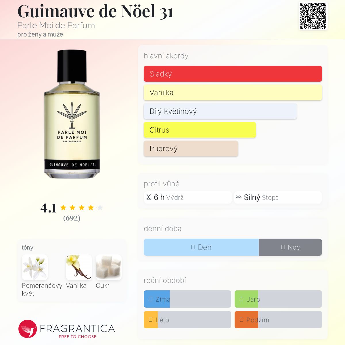 Guimauve de Nöel 31 podle Parle Moi de Parfum je Orientální Vanilla vůně pro ženy a muže. Guimauve de Nöel 31 byl/a uveden/a v roce 2016. "Nosem" za touto vůní je Michel Almairac.