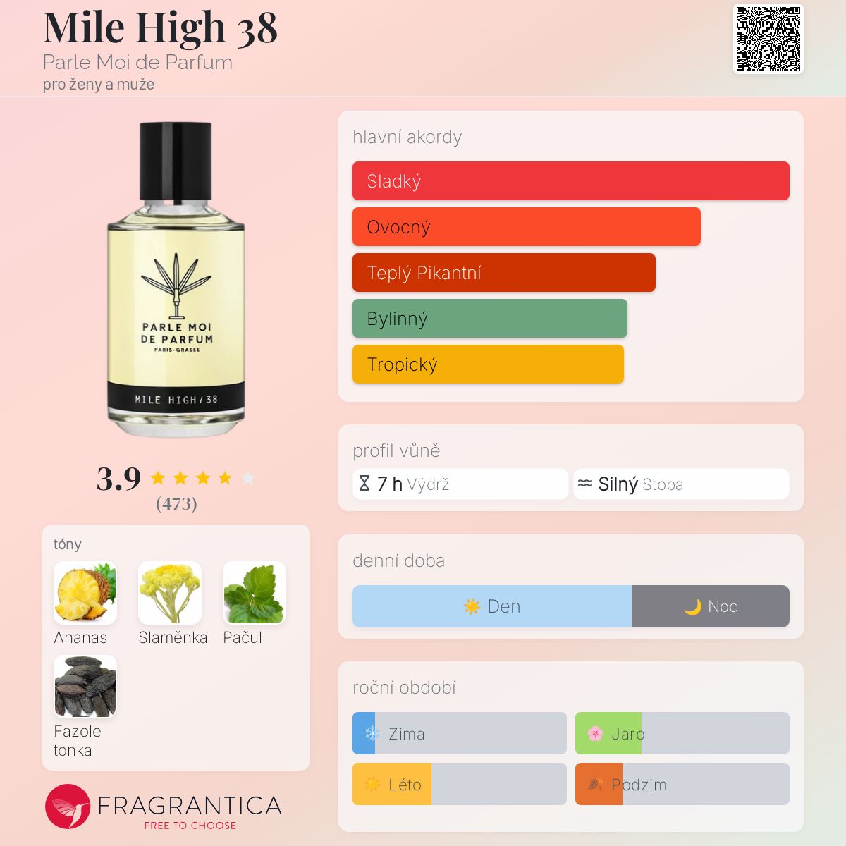 Mile High 38 podle Parle Moi de Parfum je Chypre Fruity vůně pro ženy a muže. Mile High 38 byl/a uveden/a v roce 2020. "Nosem" za touto vůní je Michel Almairac.