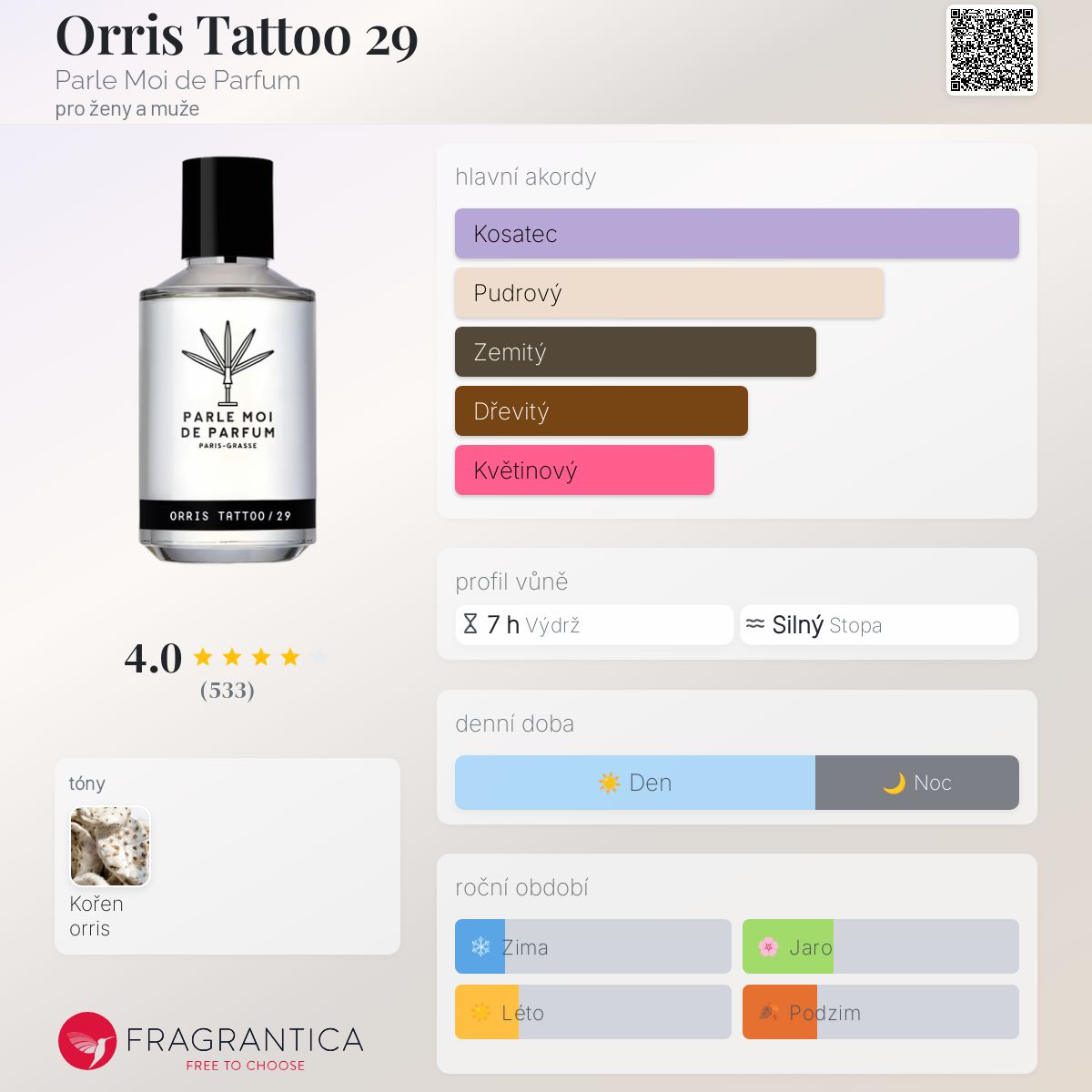 Orris Tattoo 29 podle Parle Moi de Parfum je Orientální Floral vůně pro ženy a muže. Orris Tattoo 29 byl/a uveden/a v roce 2018. "Nosem" za touto vůní je Michel Almairac.