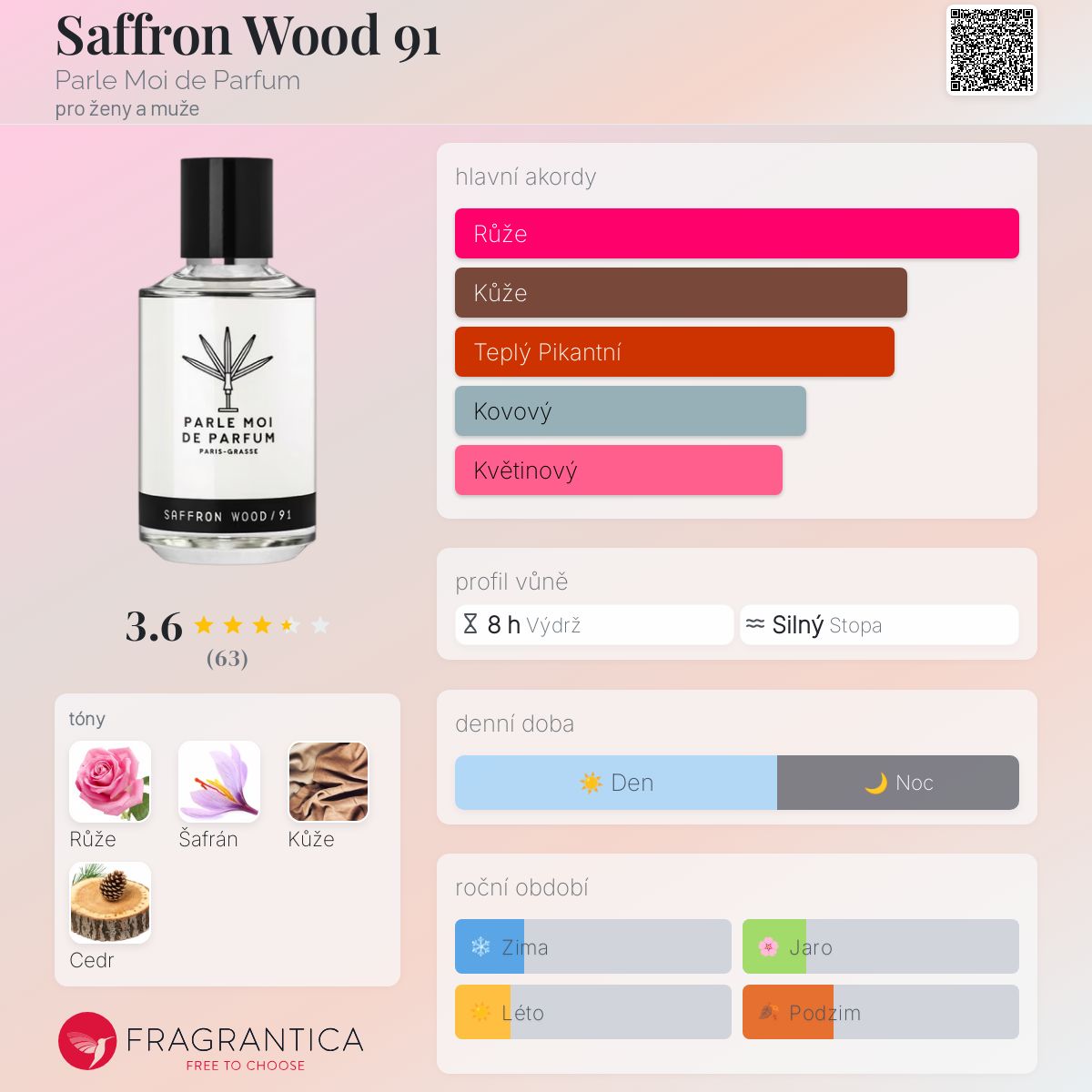 Saffron Wood 91 podle Parle Moi de Parfum je Woody Spicy vůně pro ženy a muže. Saffron Wood 91 byl/a uveden/a v roce 2019. "Nosem" za touto vůní je Michel Almairac.