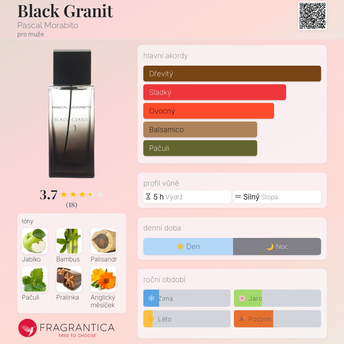 Black Granit podle Pascal Morabito je vůně pro muže. Black Granit byl/a uveden/a v roce 2013. "Nosem" za touto vůní je Corinne Cachen. Vrchní tóny jsou Zelené jablko, Měsíček a Bergamot; střední tóny jsouBambus, Palisandr a Kardamom ; základní tóny jsou Pačuli, Pralinka a Pižmo.