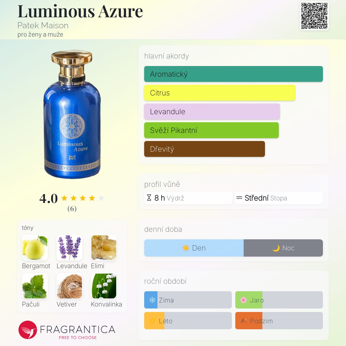 Luminous Azure podle Patek Maison je vůně pro ženy a muže. Vrchní tóny jsou Bergamot, Elemi a Konvalinka; střední tóny jsouLevandule, Kardamom, Růže a Pivoňka ; základní tóny jsou Pačuli, Vetiver, Kůže, Jantar (ambra) a Vanilka.