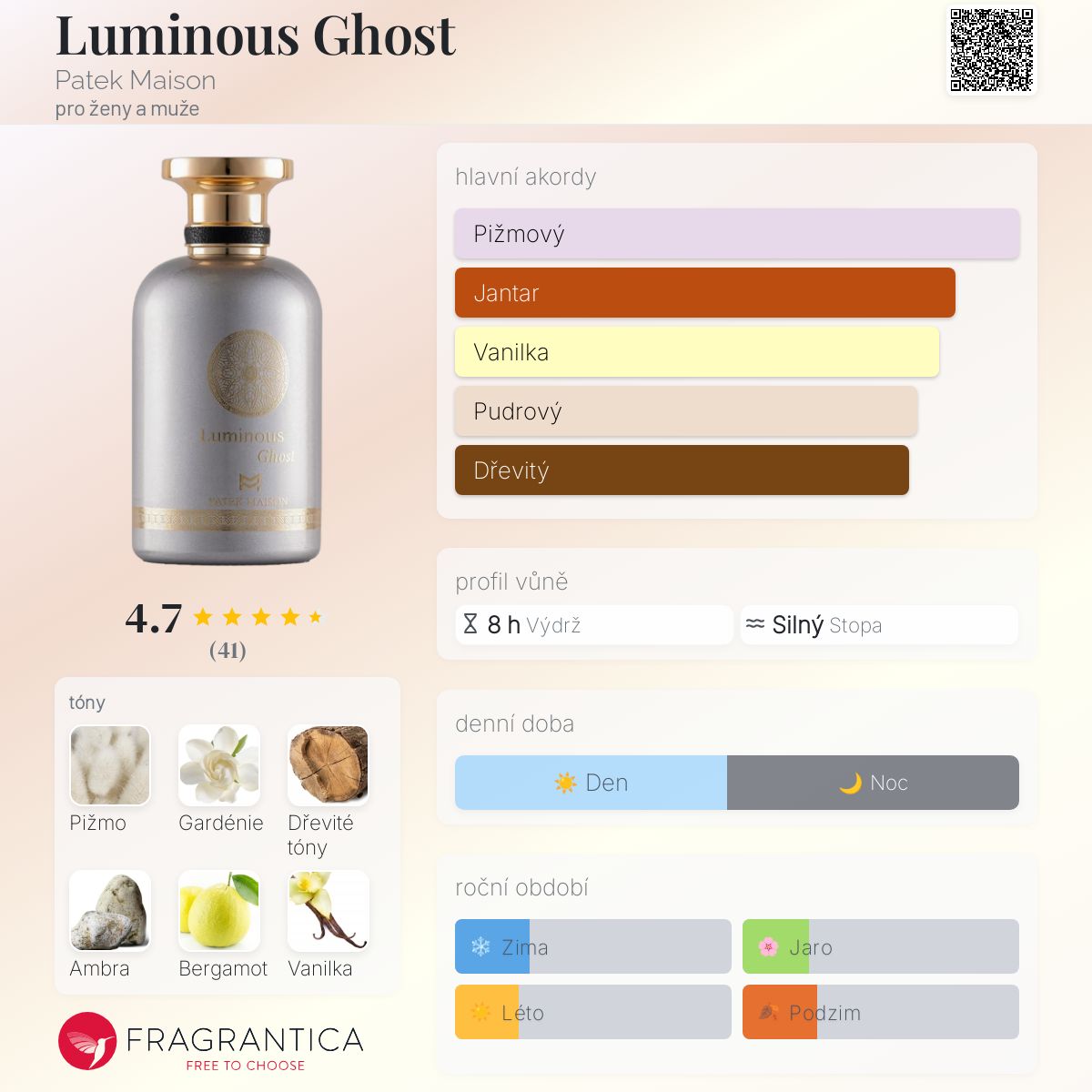 Luminous Ghost podle Patek Maison je Orientální Woody vůně pro ženy a muže. Vrchní tóny jsou Gardénie, Bergamot a Koriandr; střední tóny jsouVanilka a Jablko ; základní tóny jsou Bílé pižmo, Dřevité tóny, Ambra a Fazole tonka.