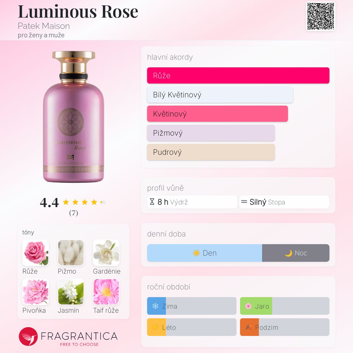Luminous Rose podle Patek Maison je Floral vůně pro ženy a muže. Vrchní tóny jsou Gardénie, Pivoňka a Bergamot; střední tóny jsouBulharská růže, Jasmín a Taif růže ; základní tóny jsou Pižmo, Santalové dřevo a Cedr.