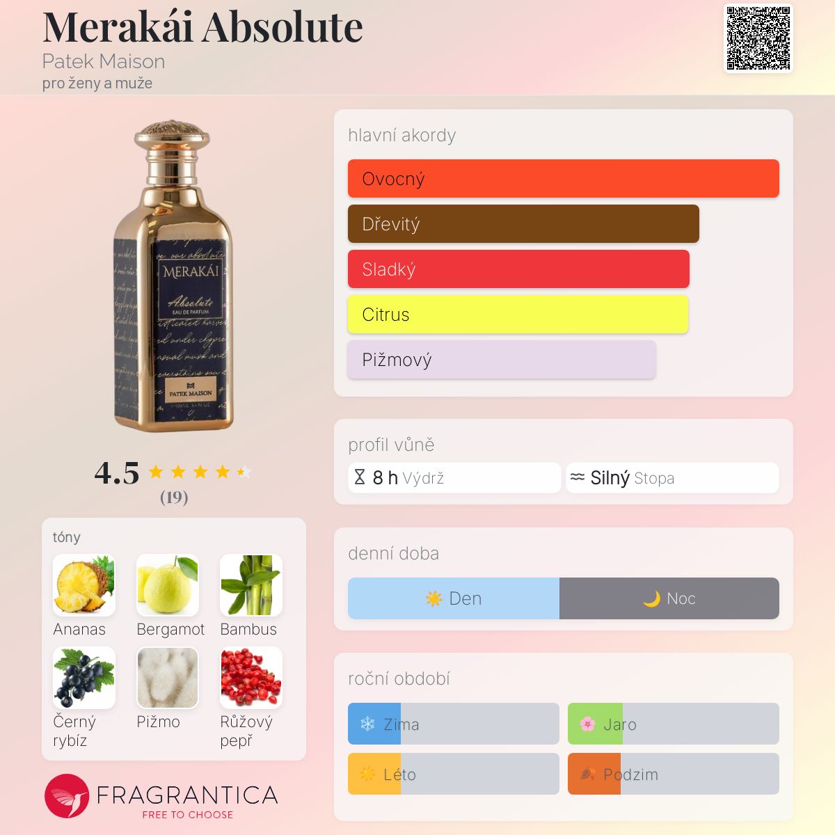 Merakái Absolute podle Patek Maison je Chypre Fruity vůně pro ženy a muže. Vrchní tóny jsou Ananas, Bergamot a Růžový pepř; střední tóny jsouBambus, Černý rybíz, Kůže a Růže ; základní tóny jsou Pižmo, Pačuli, Kakao a Vanilka.