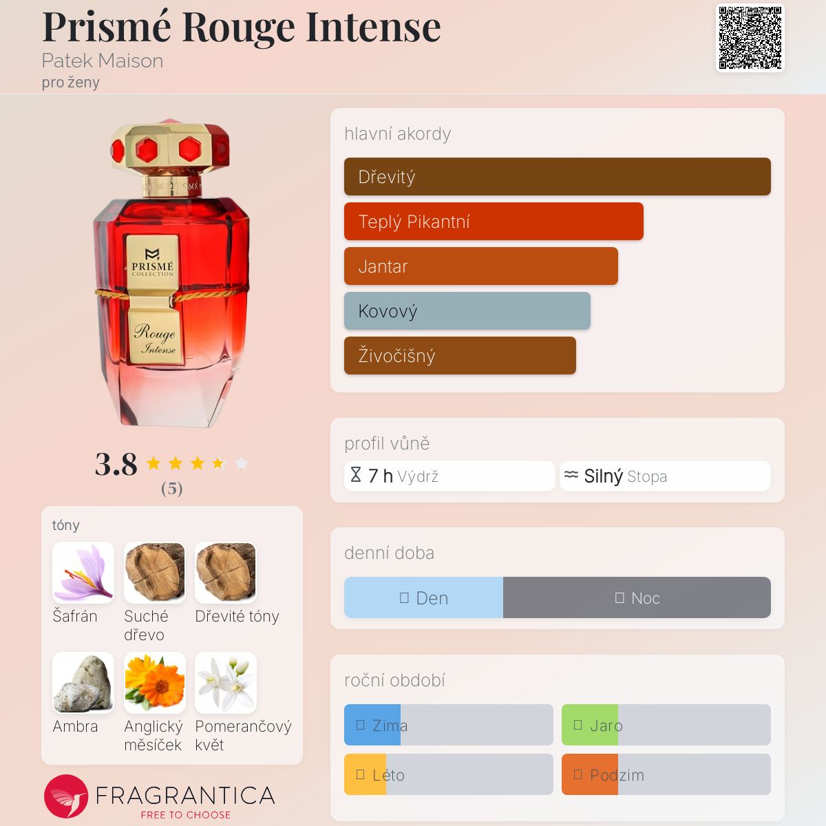Prismé Rouge Intense podle Patek Maison je Orientální vůně pro ženy. Toto je nová vůně. Prismé Rouge Intense byl/a uveden/a v roce 2024. Vrchní tóny jsou Šafrán, Měsíček, Červené ovoce a Jasmín; střední tóny jsouBílé dřevo, Pomerančový květ, Cukr a Bílé květy ; základní tóny jsou Suché dřevo, Ambra, Kašmírové dřevo a Mech.