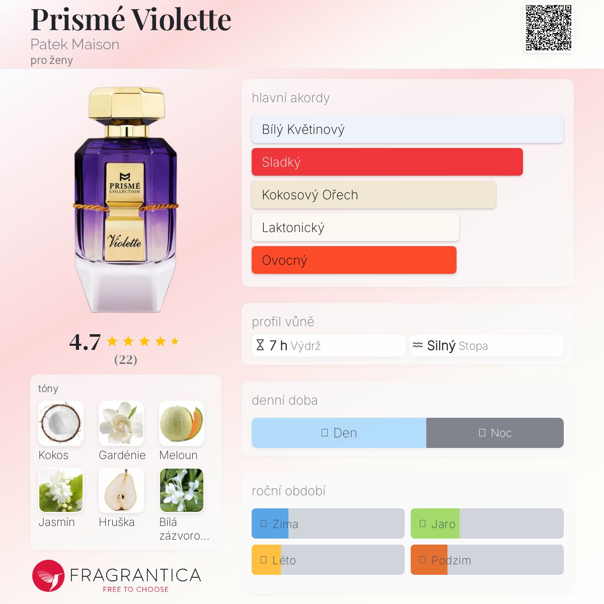 Prismé Violette podle Patek Maison je Floral Fruity vůně pro ženy. Vrchní tóny jsou Gardénie, Meloun, Hruška a Mandarinka; střední tóny jsouJasmín Sambac, Bílá zázvorová lilie a Med ; základní tóny jsou Kokosové mléko, Fazole tonka a Naplavené dříví.