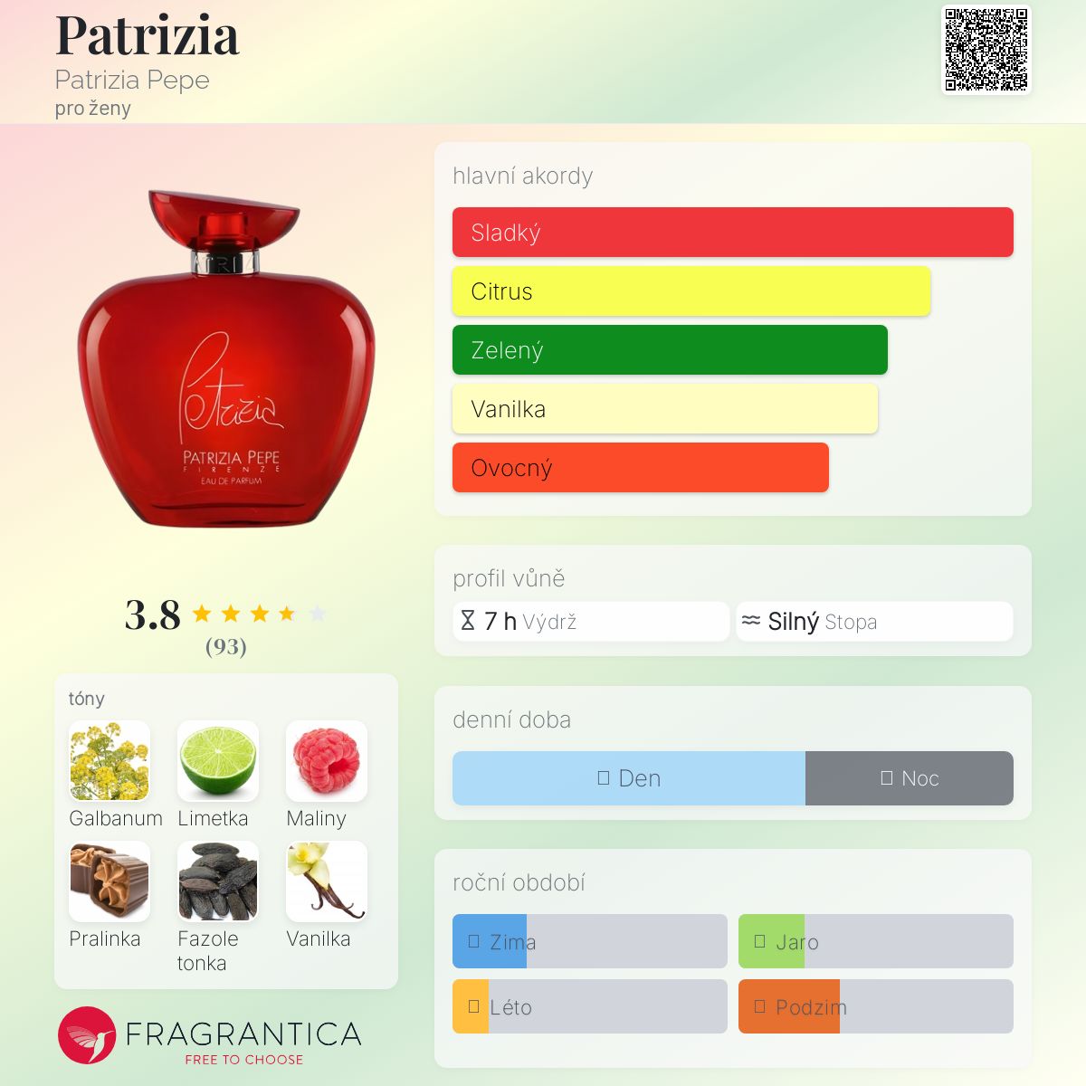 Patrizia podle Patrizia Pepe je Floral Fruity Gourmand vůně pro ženy. Patrizia byl/a uveden/a v roce 2011. "Nosem" za touto vůní je Sophie Labbe. Vrchní tóny jsou Limetka, Maliny a Mandarinka; střední tóny jsouGalbanum, Pralinka a Jasmín ; základní tóny jsou Fazole tonka, Vanilka a Pižmo.