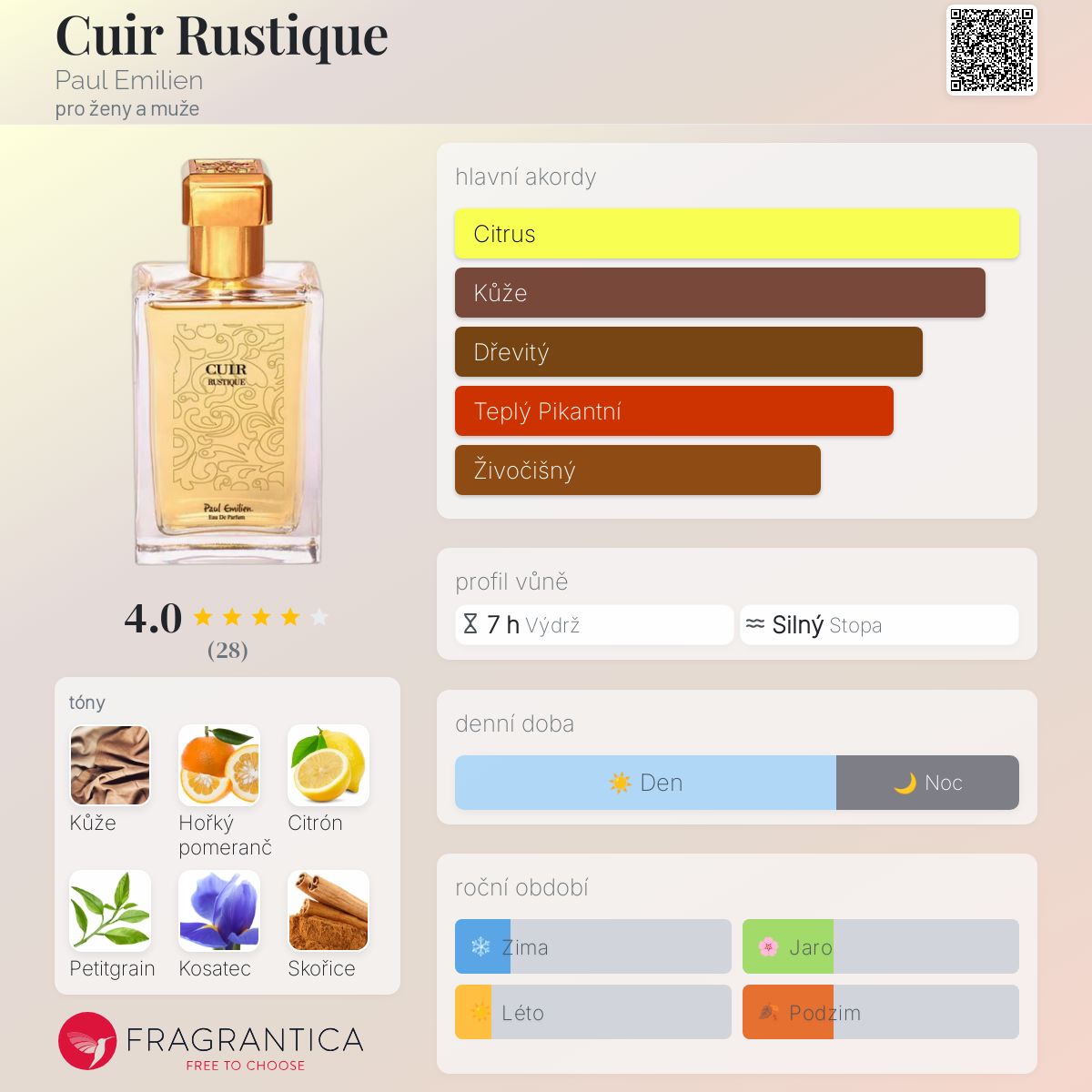 Cuir Rustique podle Paul Emilien je vůně pro ženy a muže. Cuir Rustique byl/a uveden/a v roce 2016. "Nosem" za touto vůní je Patrick Bodifée. Vrchní tóny jsou Hořký pomeranč, Sicilský citron, Paraguajský petitgrain, Indický šafrán a Červený tymián; střední tóny jsouKosatec, Cejlonská skořice, Guajakové dřevo, Hřebíček a Magnólie ; základní tóny jsou Kůže, Haitský vetiver, Labdanum, Texaský cedr a Styrax.